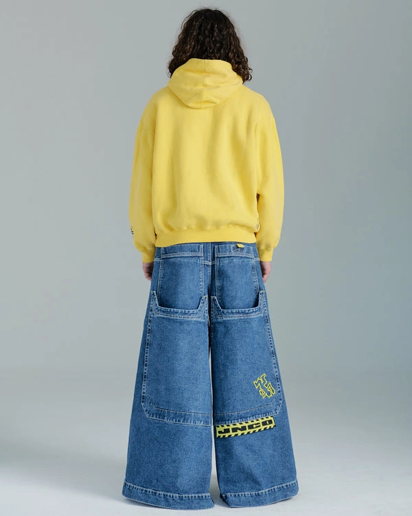 SUPER RARE! Early 2000's ULTRA wide legged jeans. JNCO style without the JNCO price ($300+ online). Jeans themself are in good condition except for very slight tattering at the bottoms which would need a little trimming if need be. Big pockets! HUGE back pocket. I'm 5 feet so the length is good if you're shorter. Definitely not for someone 6 feet.