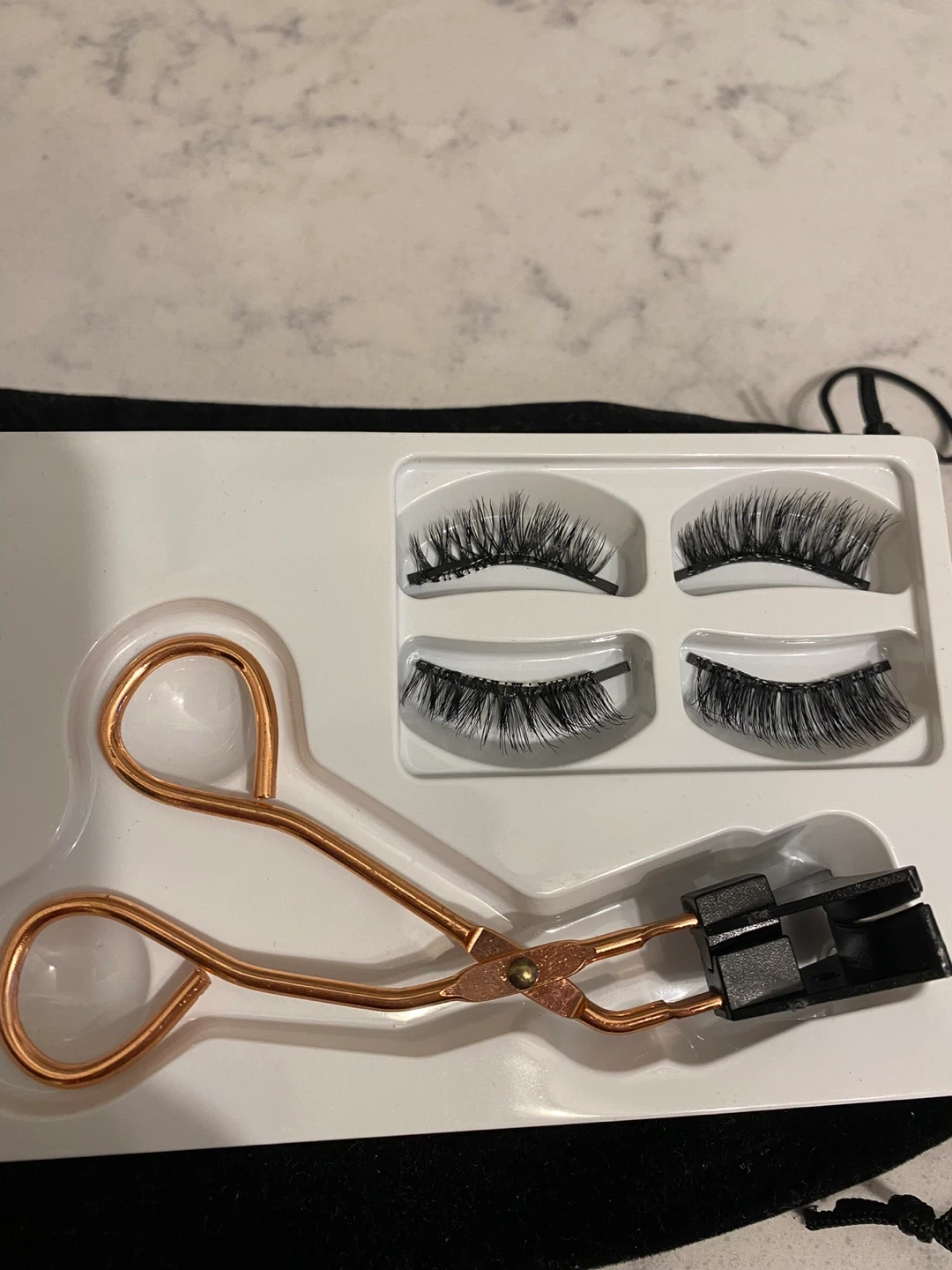Includes magnetic false eyelashes and a rose gold applicator tool. These lashes are designed for easy application without glue. The applicator helps in precise placement for a natural look. Great for achieving a fuller lash appearance quickly!