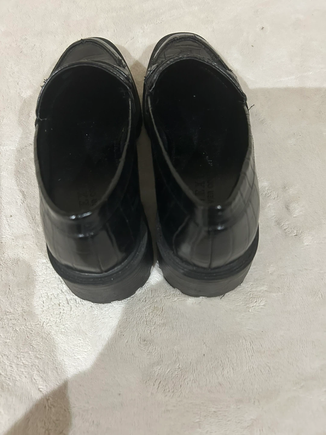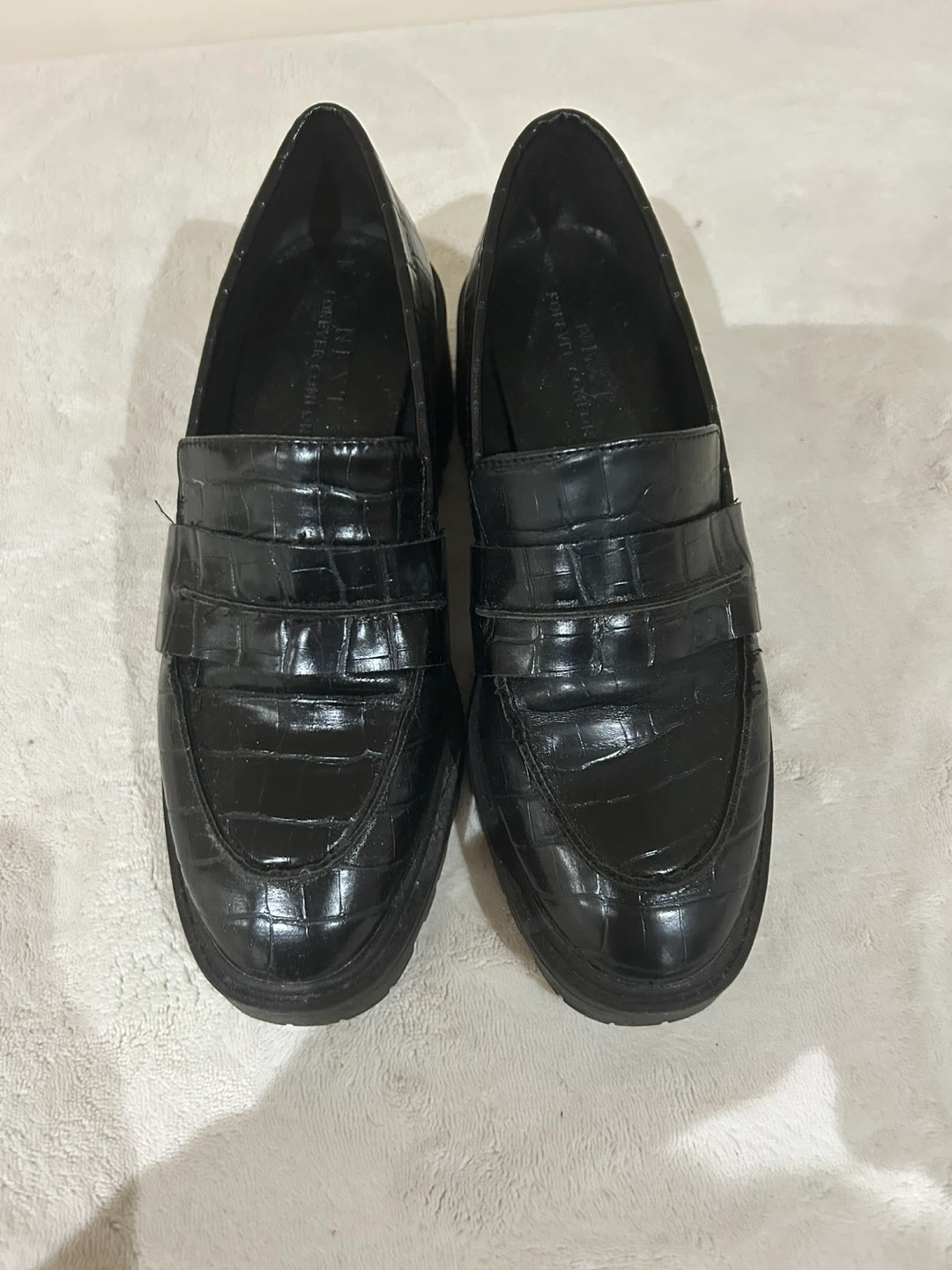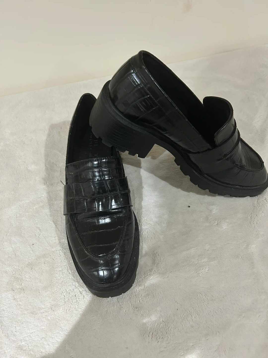 Chic black loafers with a crocodile texture. They're a stylish addition to any wardrobe. Features a lug sole for added grip and a comfortable fit. Bought in UK. Worn once.