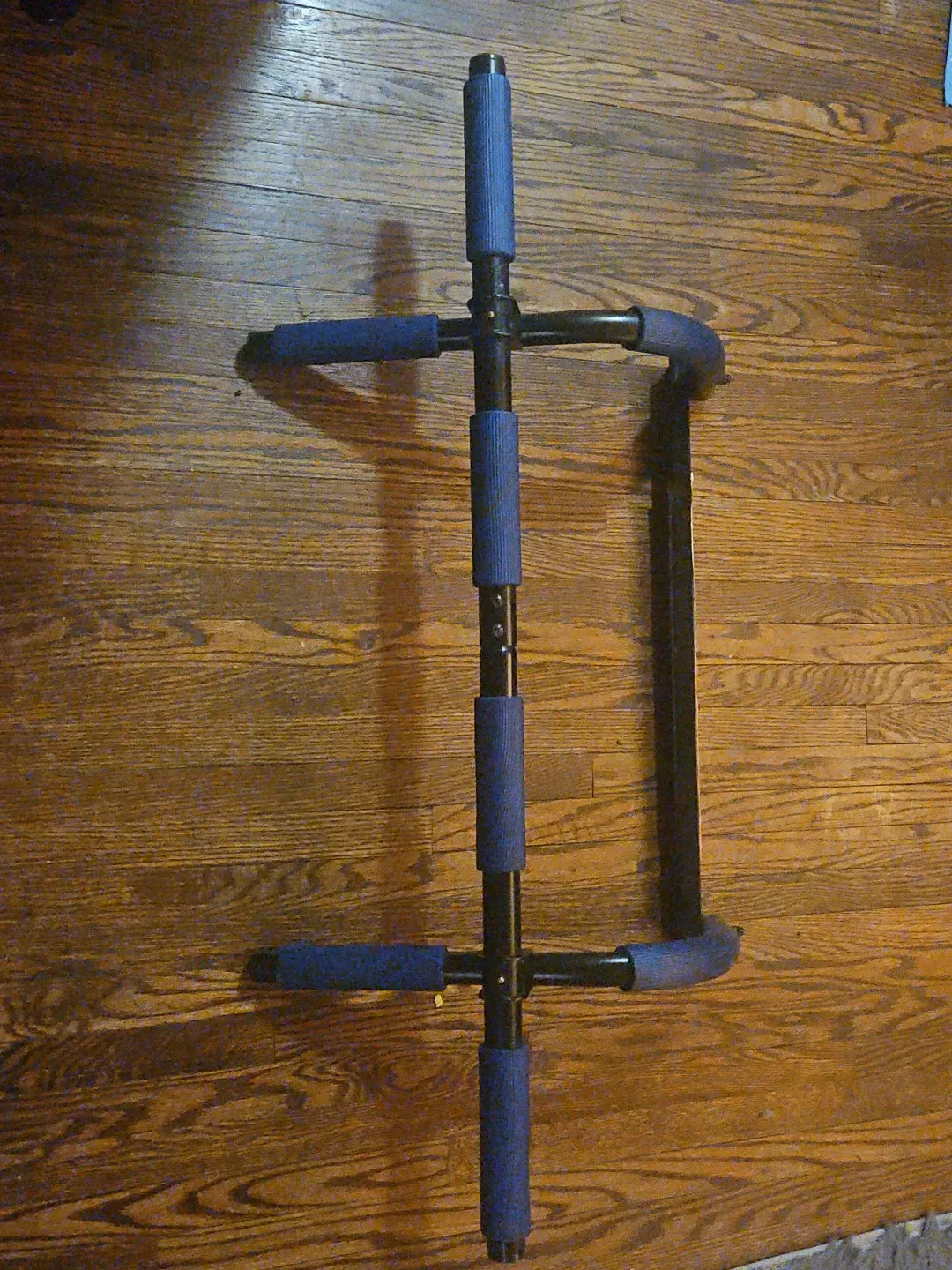 This doorway pull-up bar features padded blue grips for comfort. It's designed for easy assembly and use in most standard doorways. Also great for push-ups on the floor!