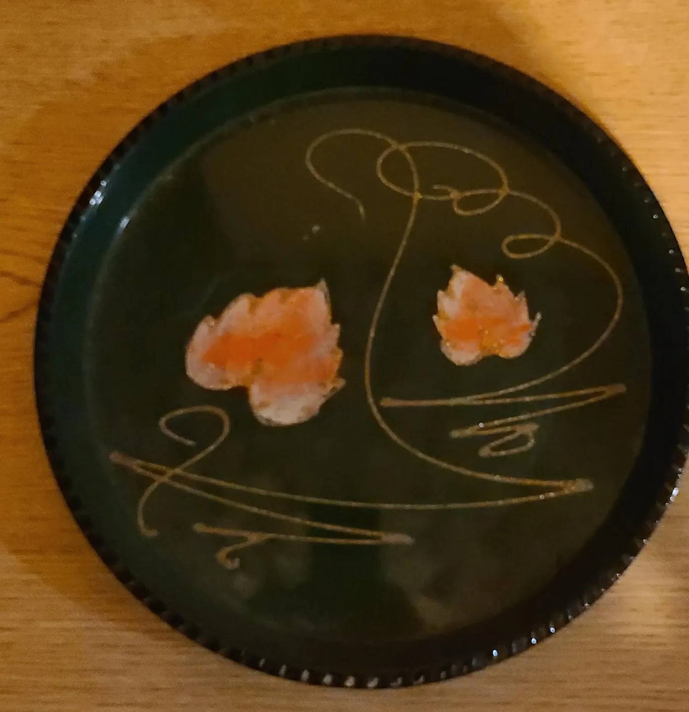 This round decorative tray features a deep green base with an artistic swirling gold design. It has two stylized orange leaves with white accents. It's a lovely piece for display or serving small items.