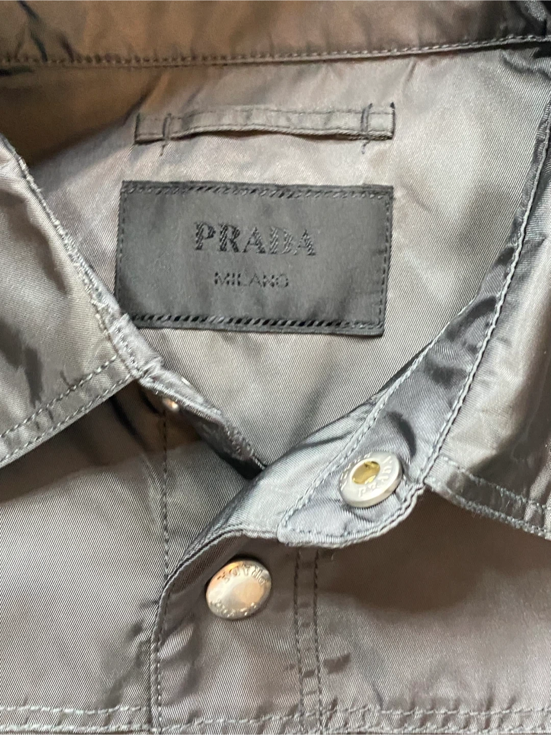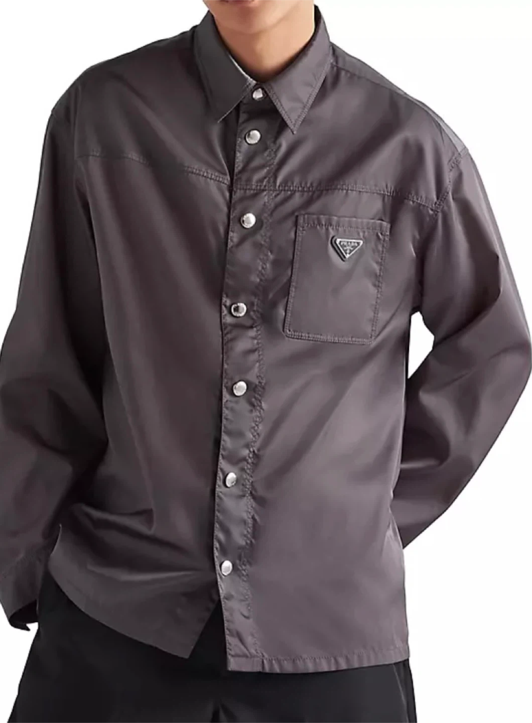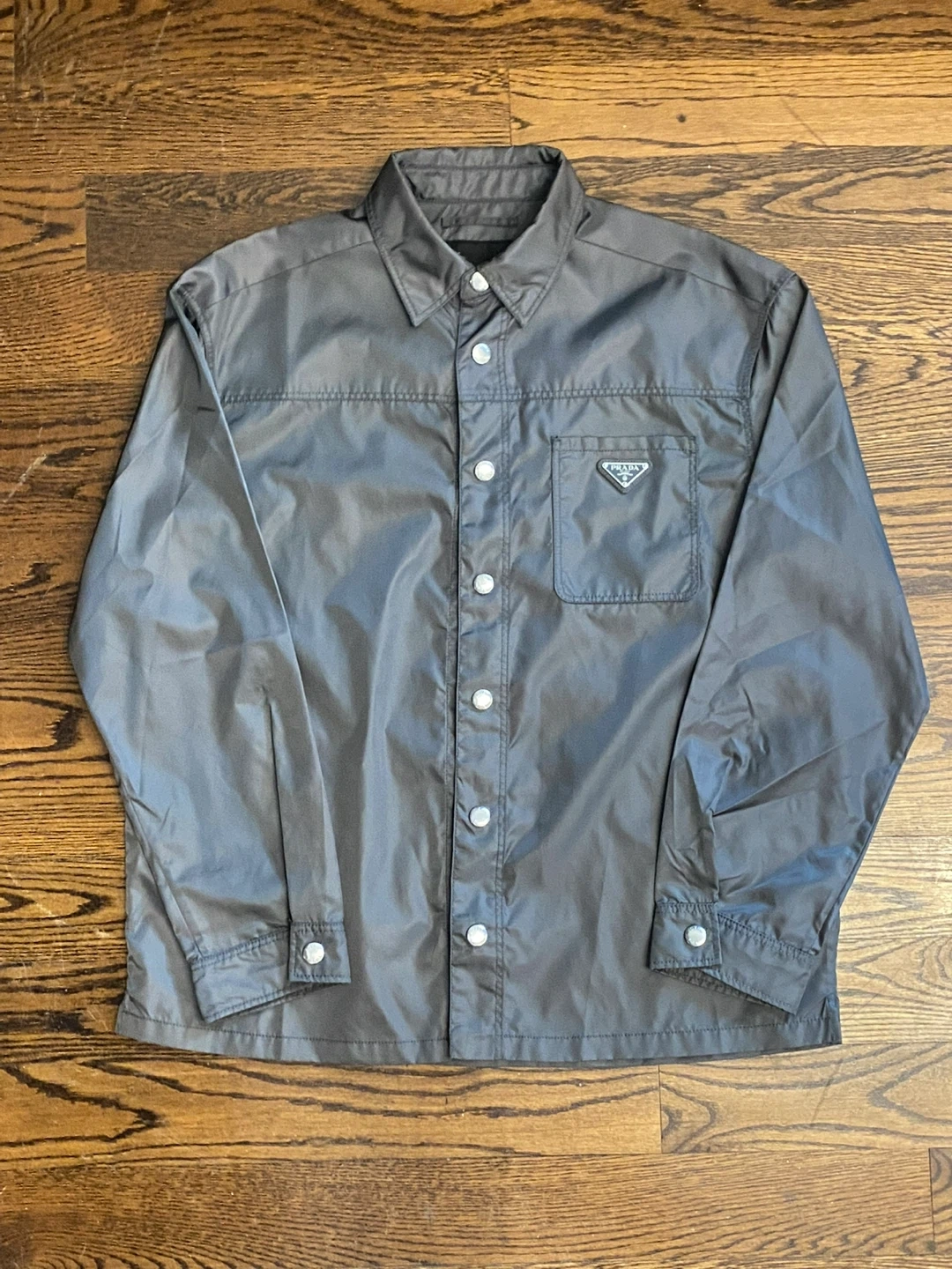 Men’s Prada loose-styled grey shirt small size or medium would fit well since it’s an oversized style. rep. Good quality. Nylon is very soft