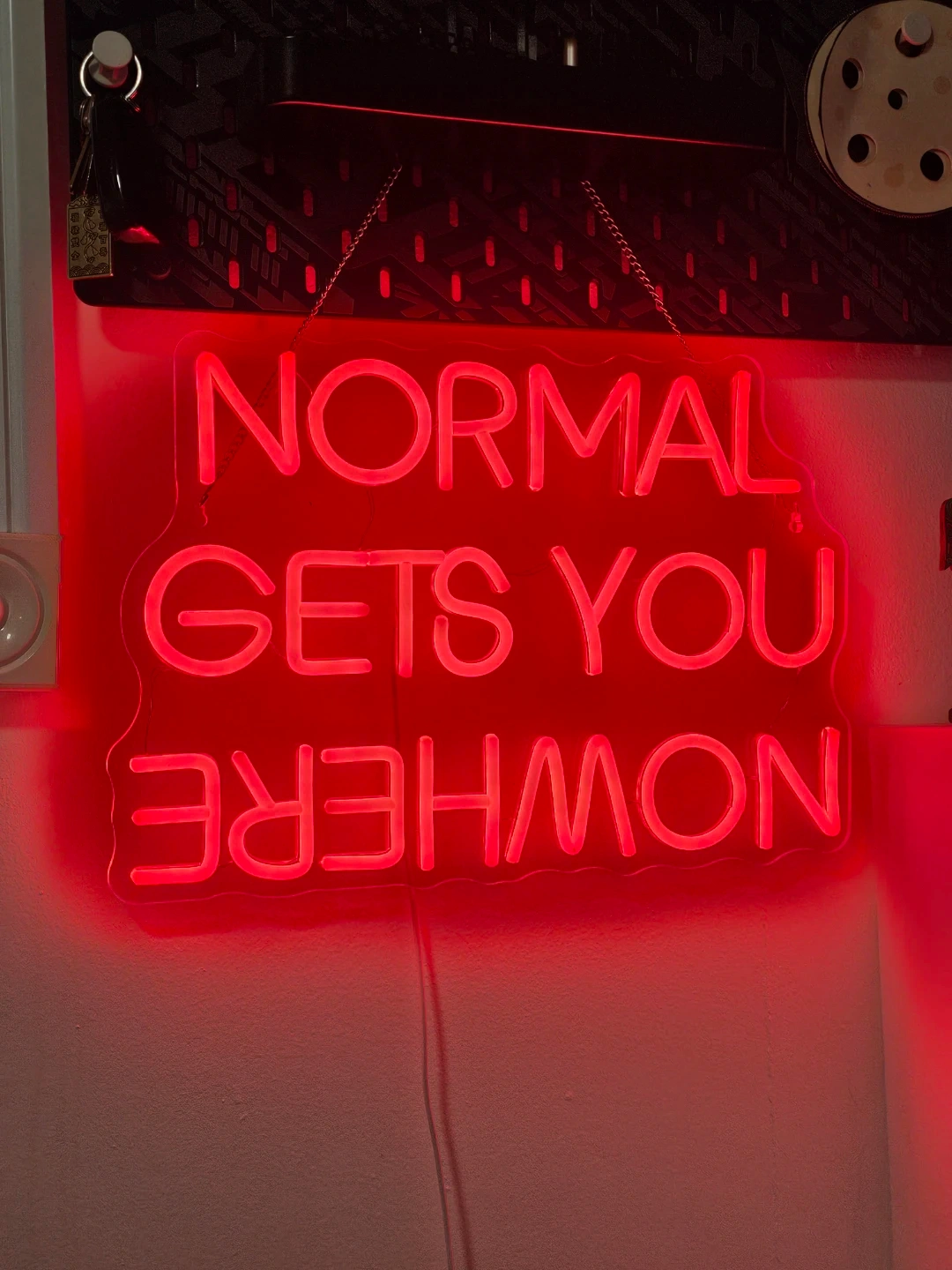 This is a red neon sign that says "Normal Gets You Nowhere". It includes a remote control for brightness adjustment. The sign is mounted on a clear acrylic backing with hanging chains.