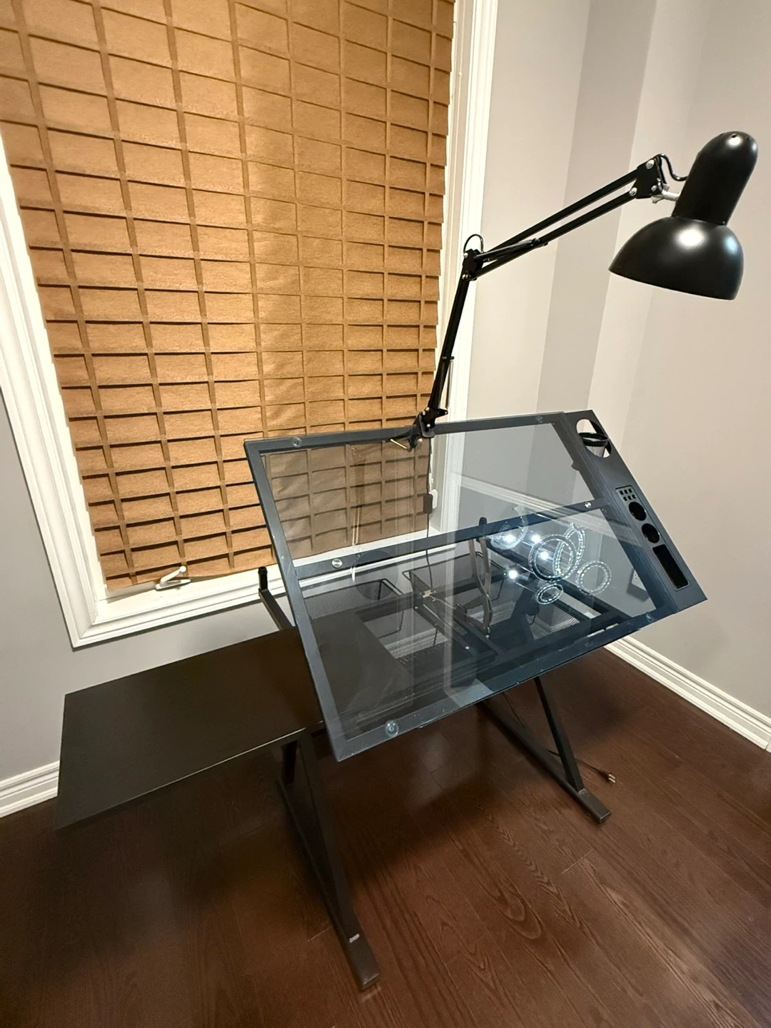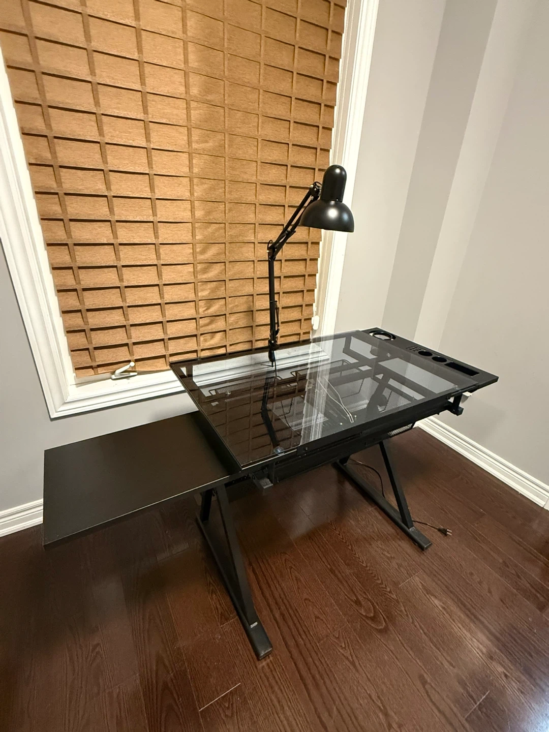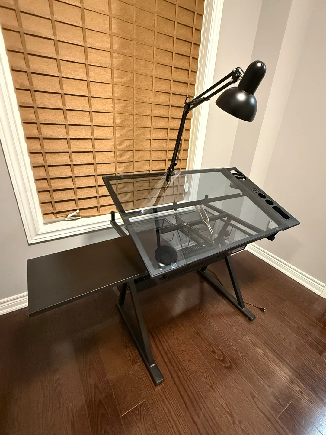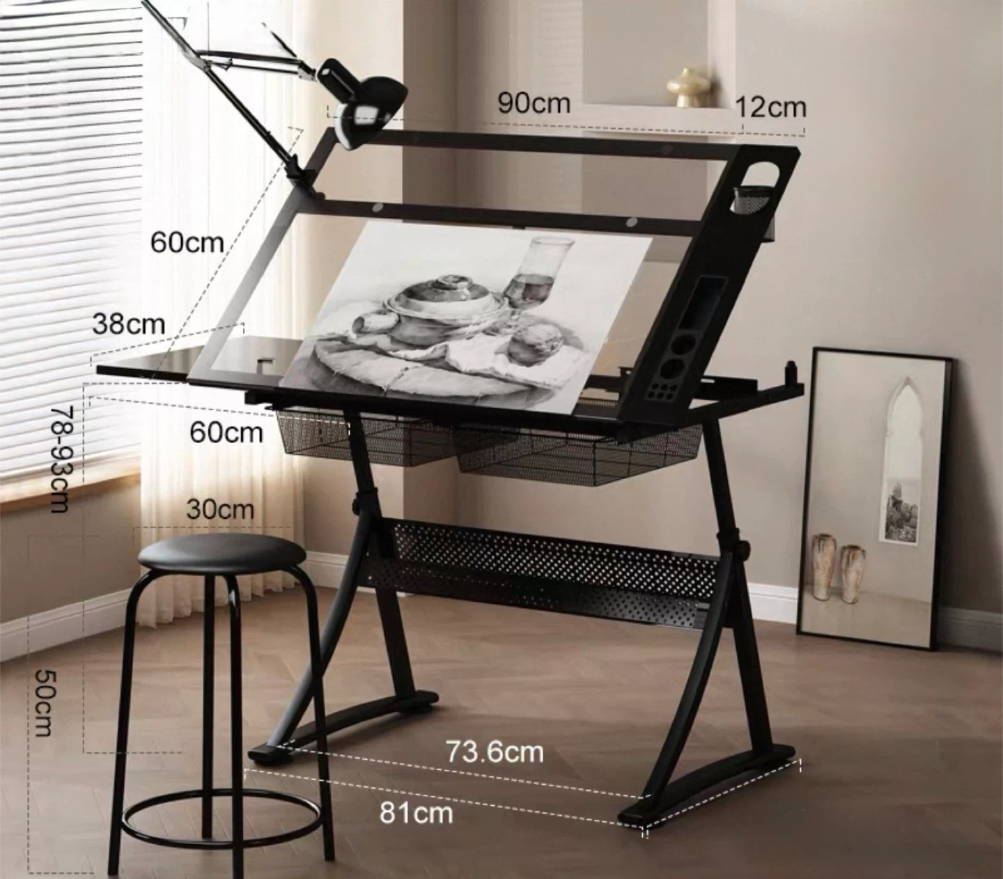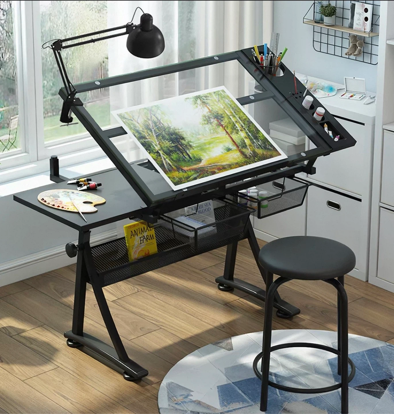 This drafting table features a tempered glass top that can be tilted for your preferred working angle. It includes an adjustable task lamp and a stool for comfortable use. The metal frame offers stability, and mesh storage baskets are built in. A side extension provides extra workspace.