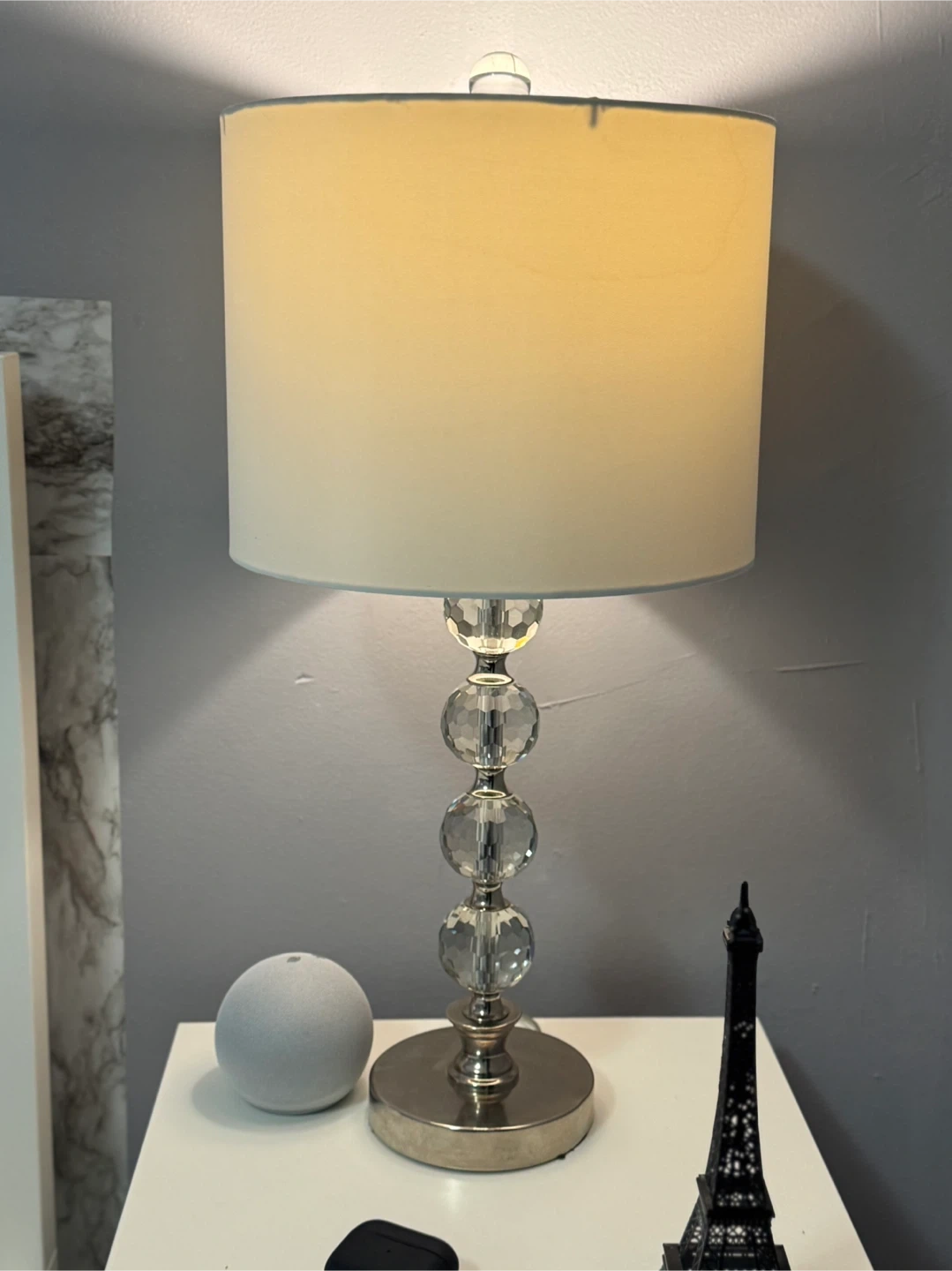 Stylish table lamp featuring a clear crystal bead accent and a beige fabric shade. It's perfect for adding a touch of elegance to your bedside or living room. Lamp base has a polished metallic finish.