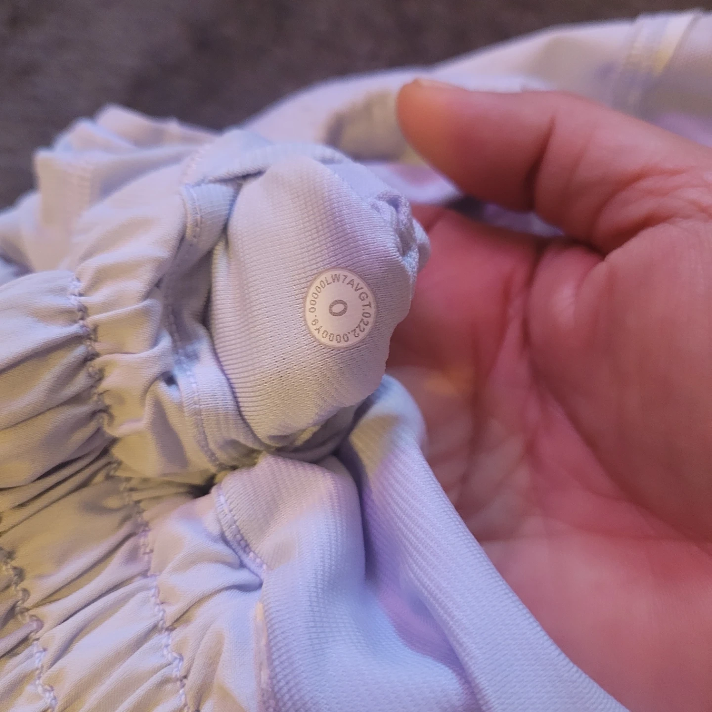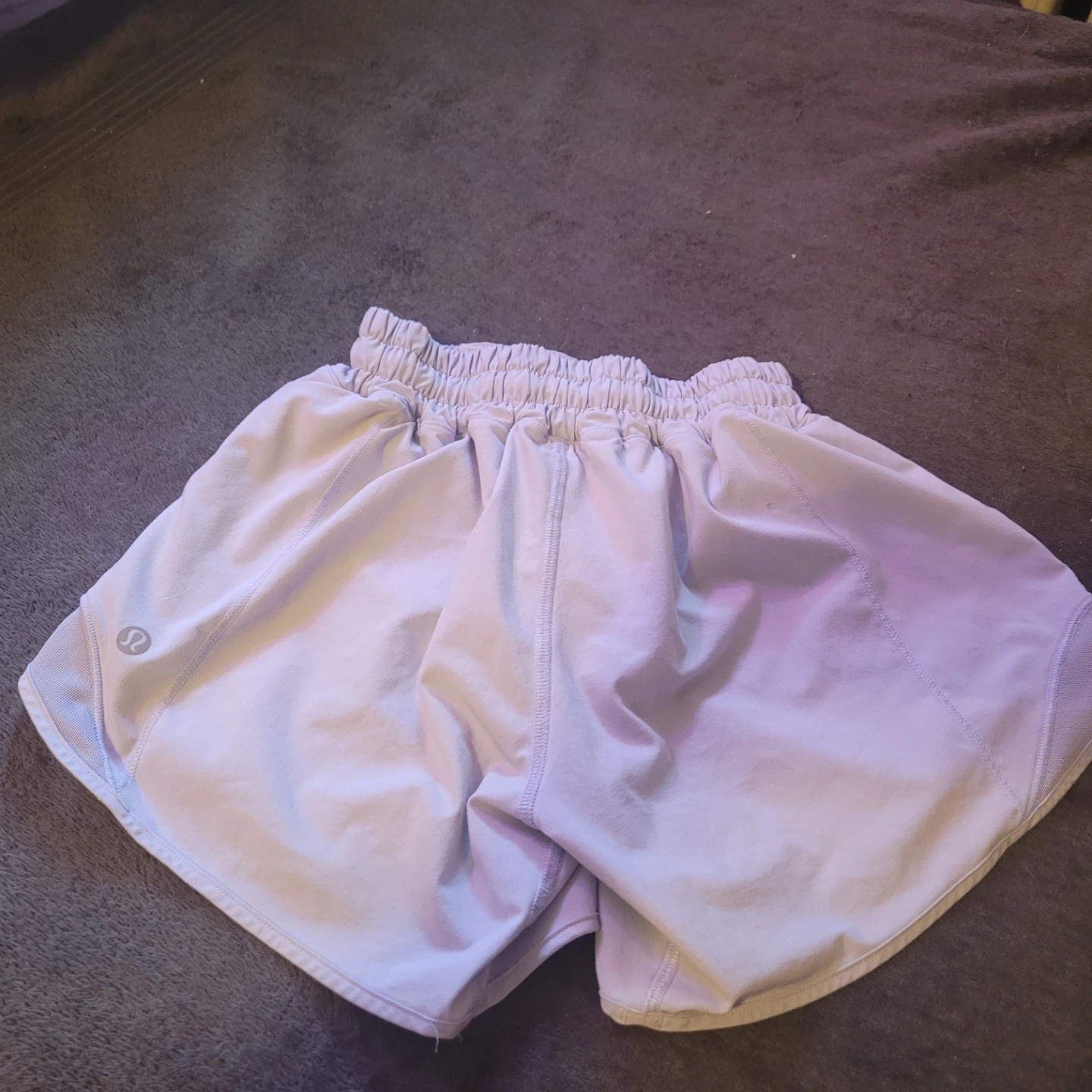 These are Lululemon running shorts in a light purple colour. They're a size 0. There are a couple of small pink marks on the front.