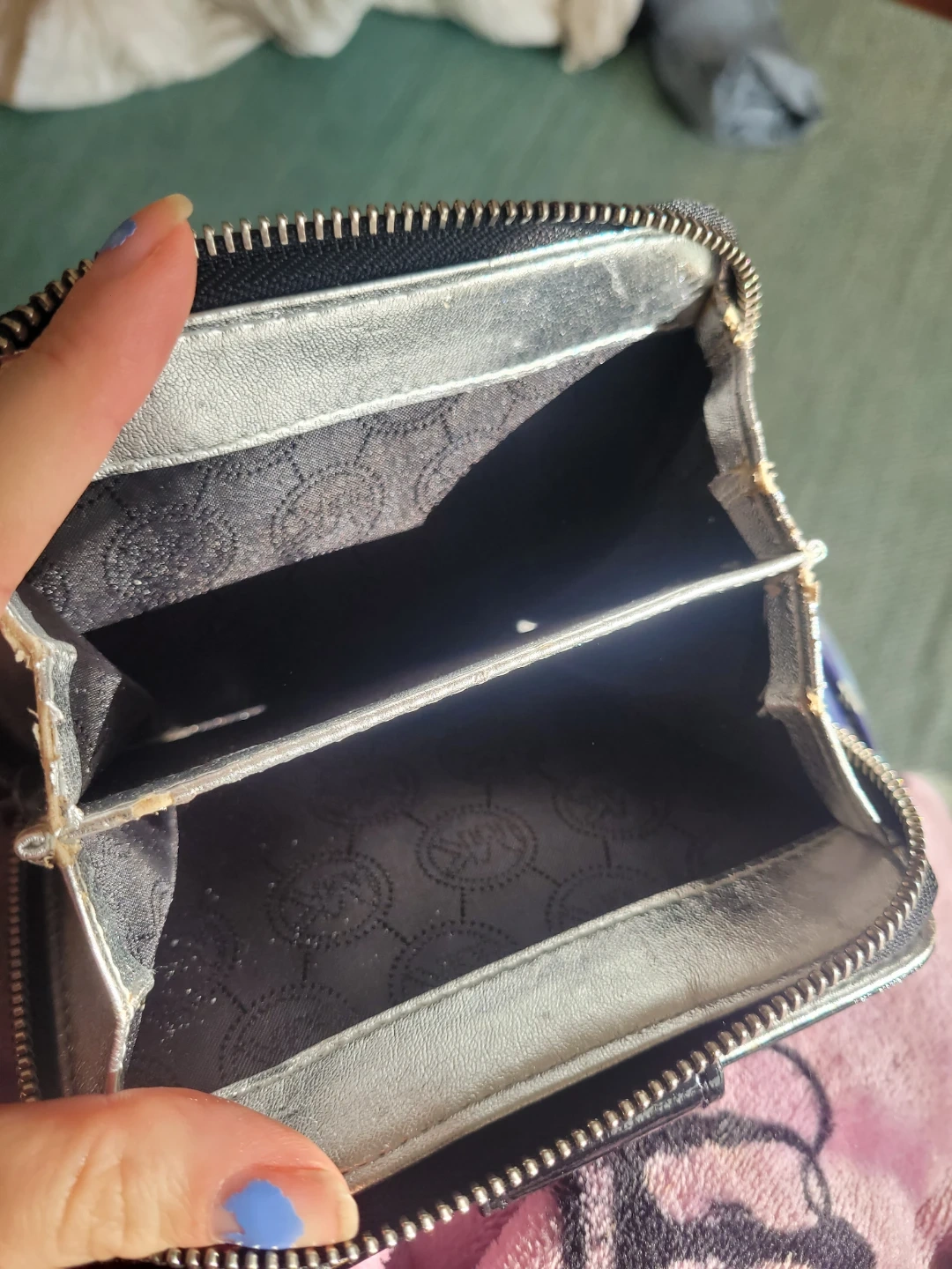 This Michael Kors wallet is black with a patent leather finish. It features a zip-around closure and multiple interior compartments for your cards and cash. The interior lining has the signature MK logo pattern. This wallet is a compact size for everyday use.