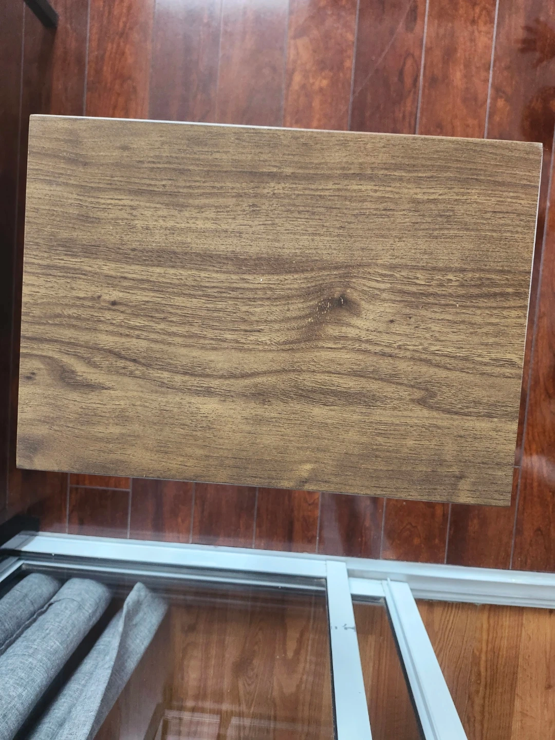 A C-shaped side table with a wood-grain top and black metal frame. It's a convenient surface for laptops or drinks. The frame has a modern, minimalist design.