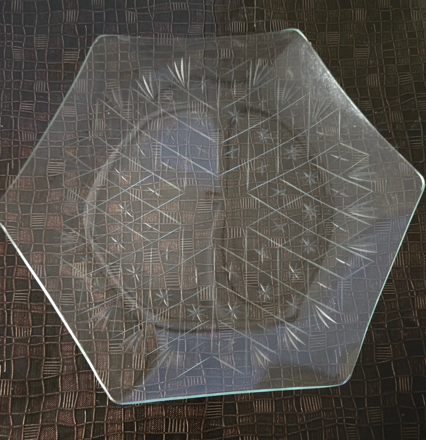 Set of five hexagonal glass plates. They feature an etched starburst and geometric pattern. These plates are clear glass. Use especially for Christmas celebration