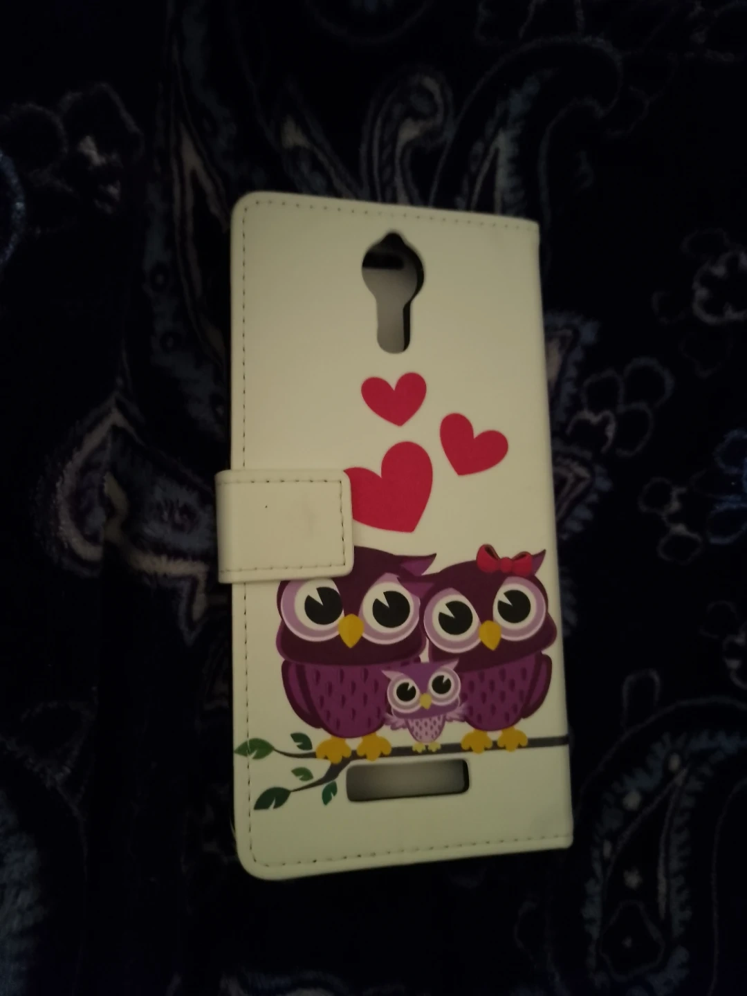 White flip case with a cute owl family design. It's a wallet-style case with card slots inside. Protects your phone in style!