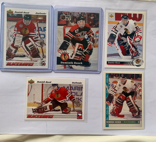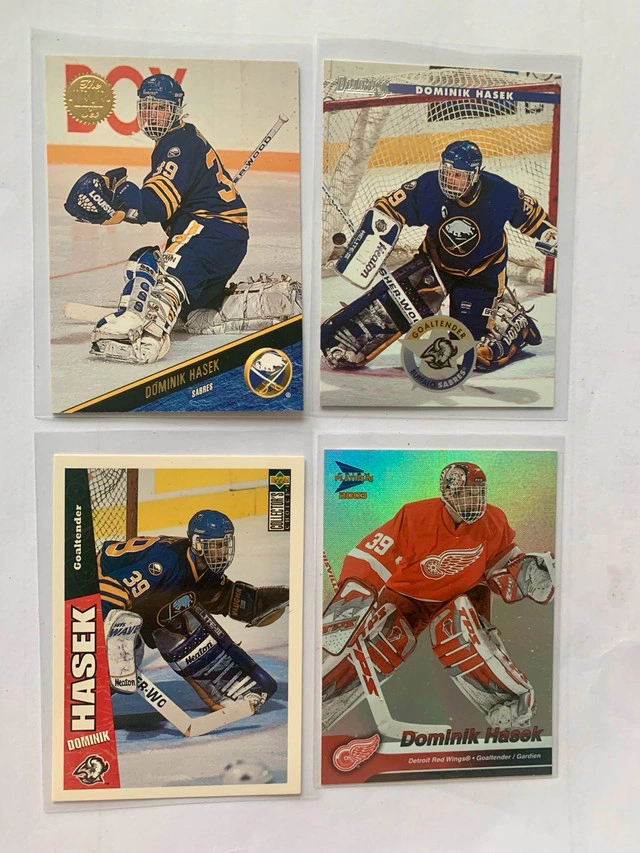 Selling a collection of 24 Dominik Hasek NHL cards, including 2 coveted rookie cards, showcasing Hasek's early years in the league. This collection features various cards from Hasek's career with the Blackhawks, Sabres and Red Wings. These cards are in excellent condition and would make a great addition to any hockey card collection. * Includes cards from various years * Features Hasek in Blackhawks, Sabres and Red Wings jerseys * Great for collectors I've checked online and similar Hasek cards go for around $2-$10 per card depending on the condition and rarity, so I'm pricing this set at $80. It's a great deal for a Hasek fan! If the ad is up, the cards are still available, so don't miss out!