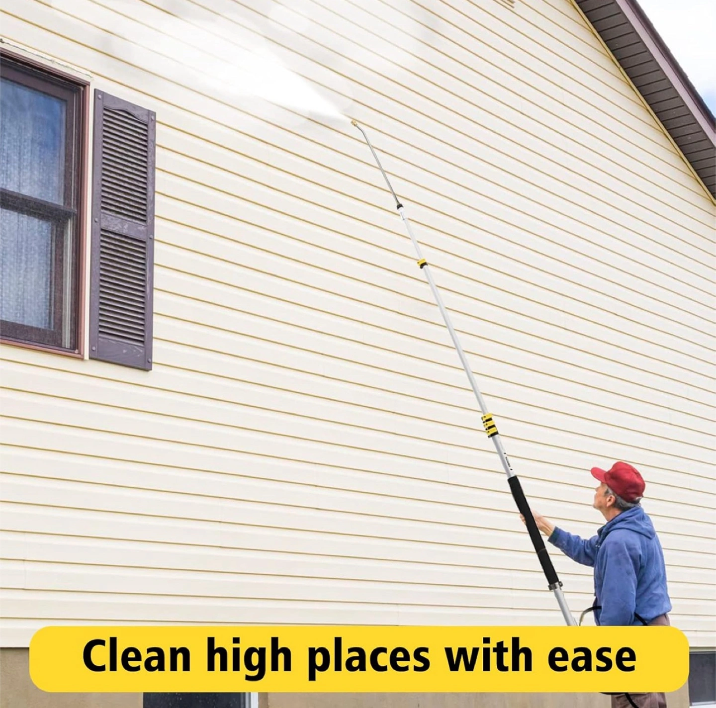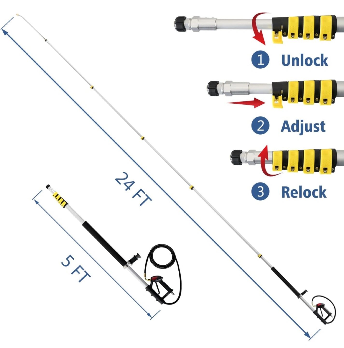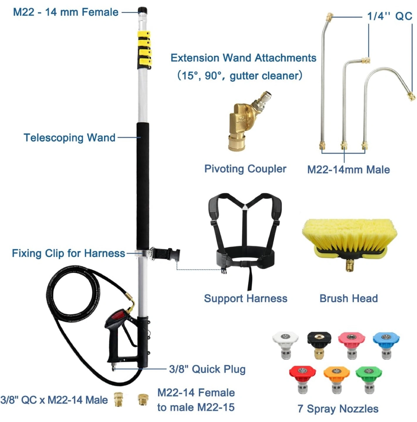 33524 FT Pressure Washer Telescoping Lance Power Washer Extension Wand Gutter Cleaner 5 Spray Nozzle Tips 2 Hose Adapters 2 Extension Wand (15 degrees & gutter cleaner) Support Belt Up to 4,000 PSI 4 adjustable sections with lever locks NOTE: New Open-box