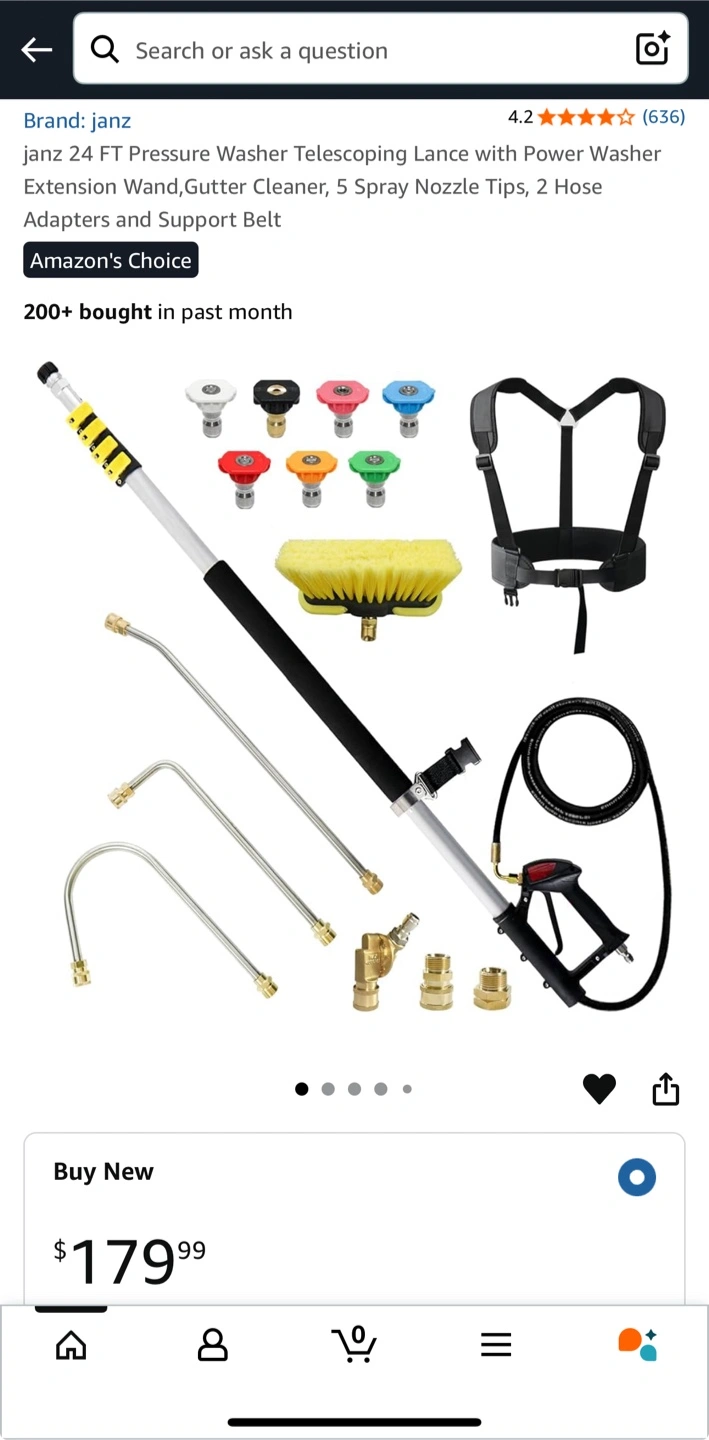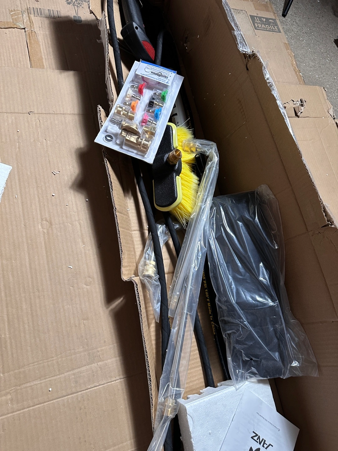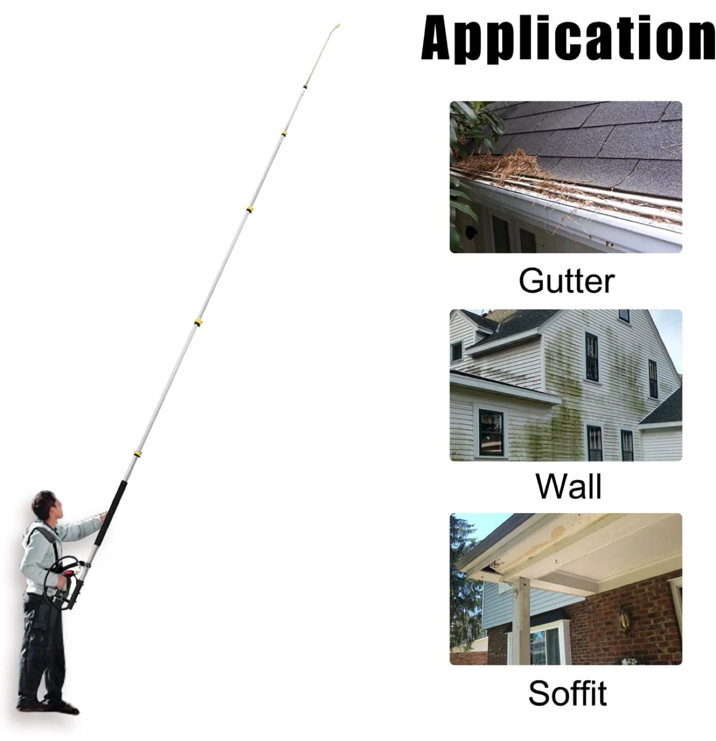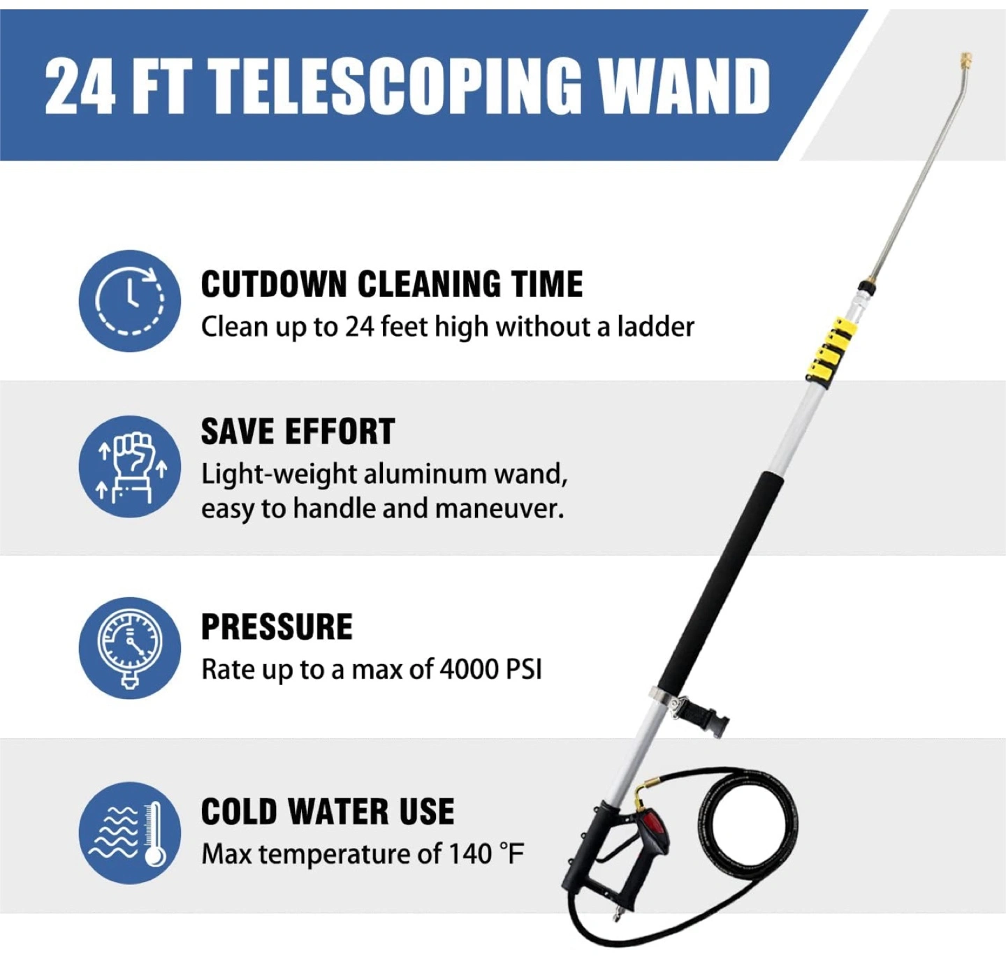 33524 FT Pressure Washer Telescoping Lance Power Washer Extension Wand Gutter Cleaner 5 Spray Nozzle Tips 2 Hose Adapters 2 Extension Wand (15 degrees & gutter cleaner) Support Belt Up to 4,000 PSI 4 adjustable sections with lever locks NOTE: New Open-box