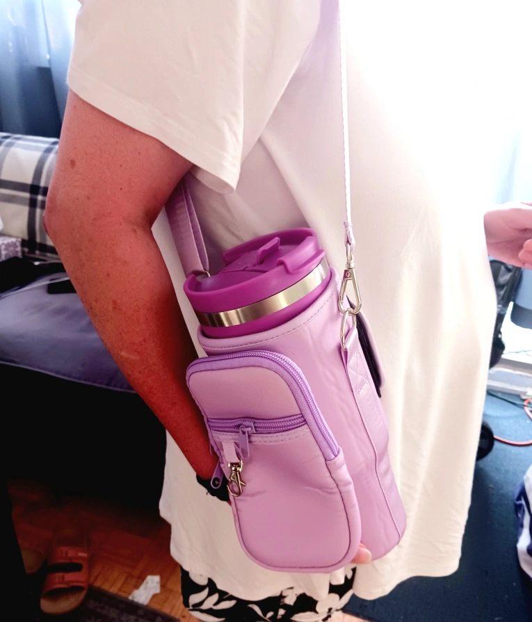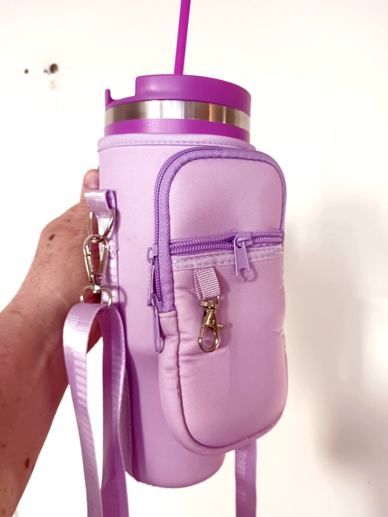 The carrier has two pockets, one for a cell phone and another for a wallet. It also has a key clip. It comes with two straps, a long one to hang over your shoulder and a short one to carry by hand. This bag also comes with a silicone straw tip cover.