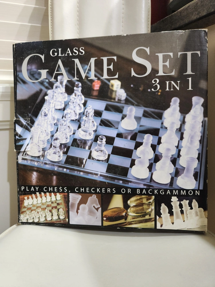 Brand new, glass 3-in-1 game set, can be used to play chess, checkers, and backgammon