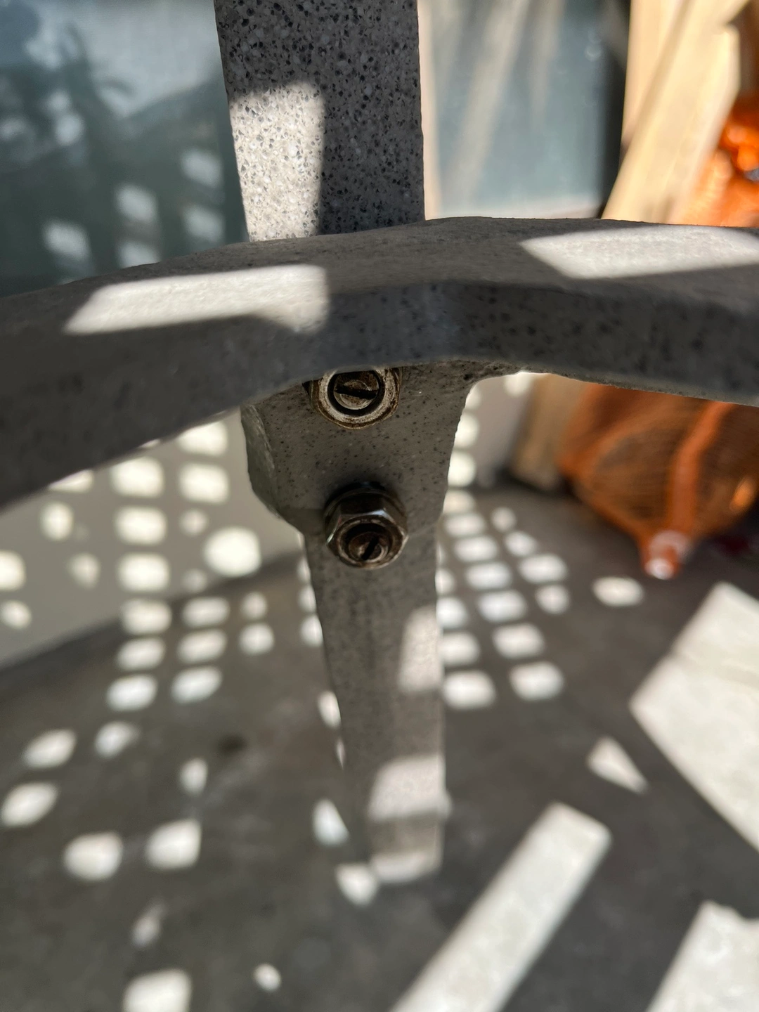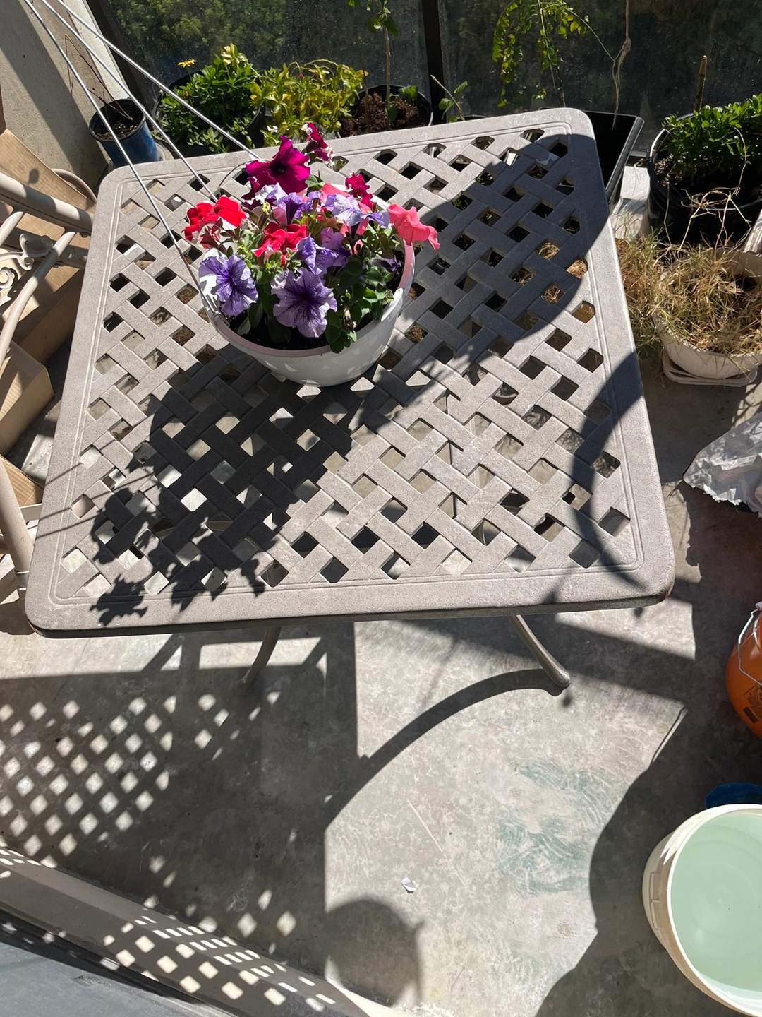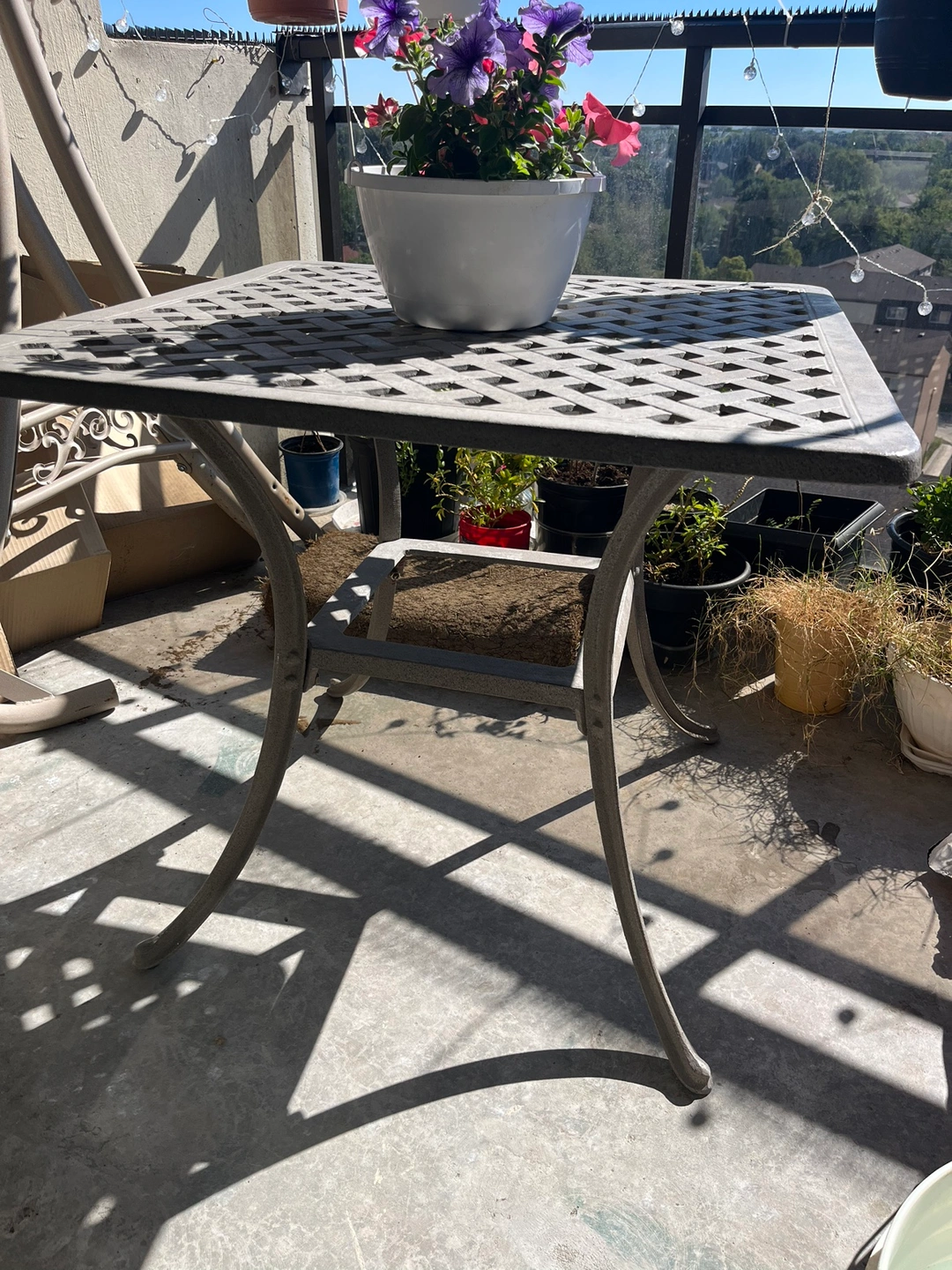 Reduced from $170 due to coating chipped at a couple of spots. Cast iron powder coated table suitable for outside size 31.5x31.5 inches height 29 inches all connected by stainless steel nut and bolts .