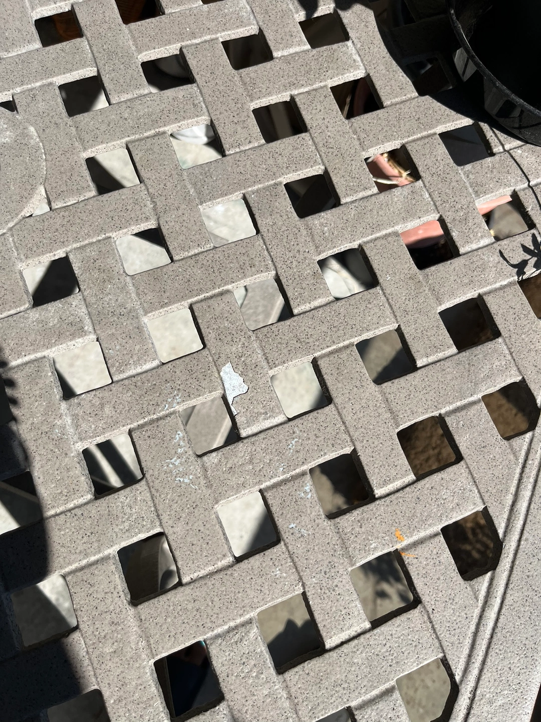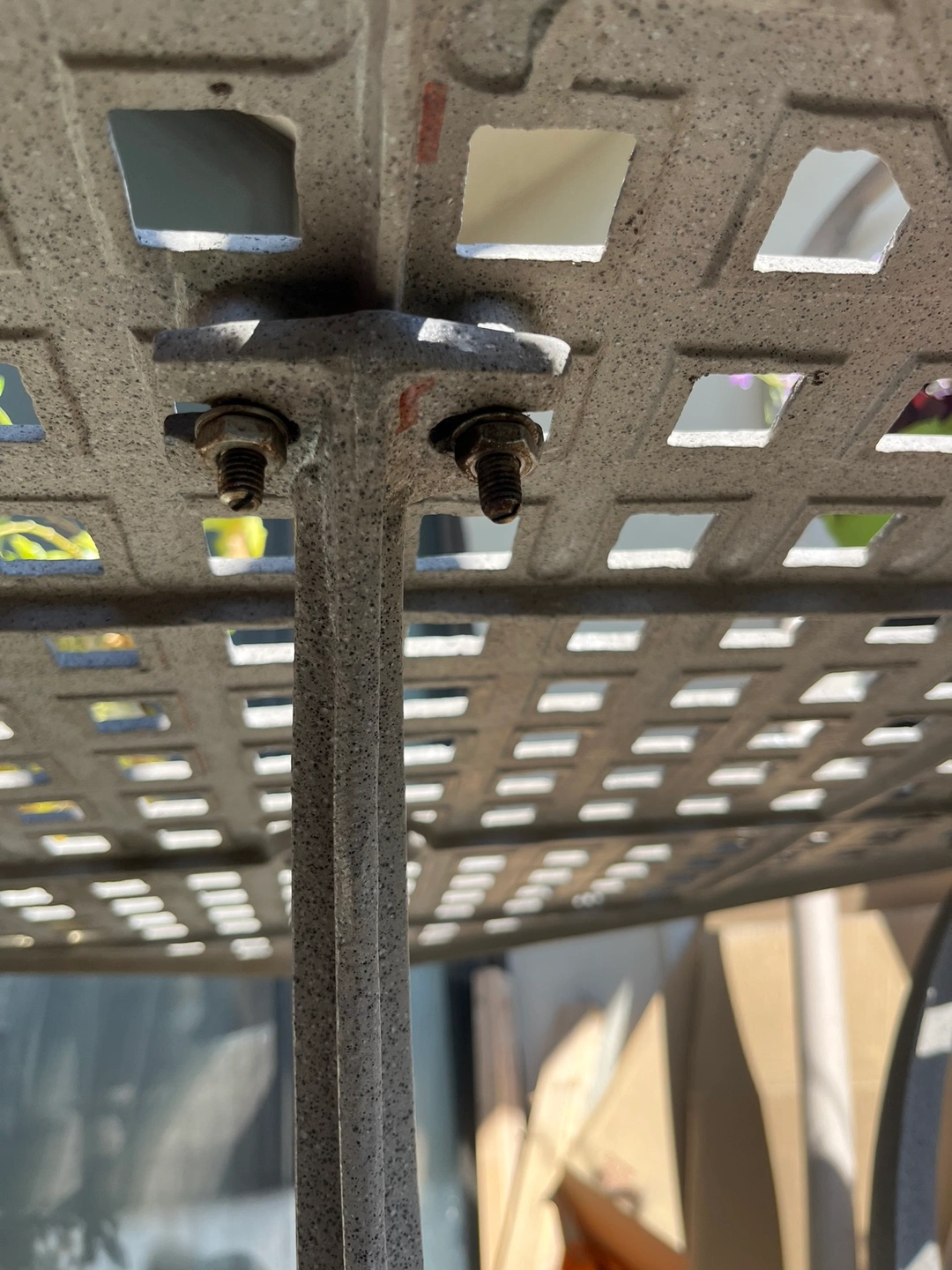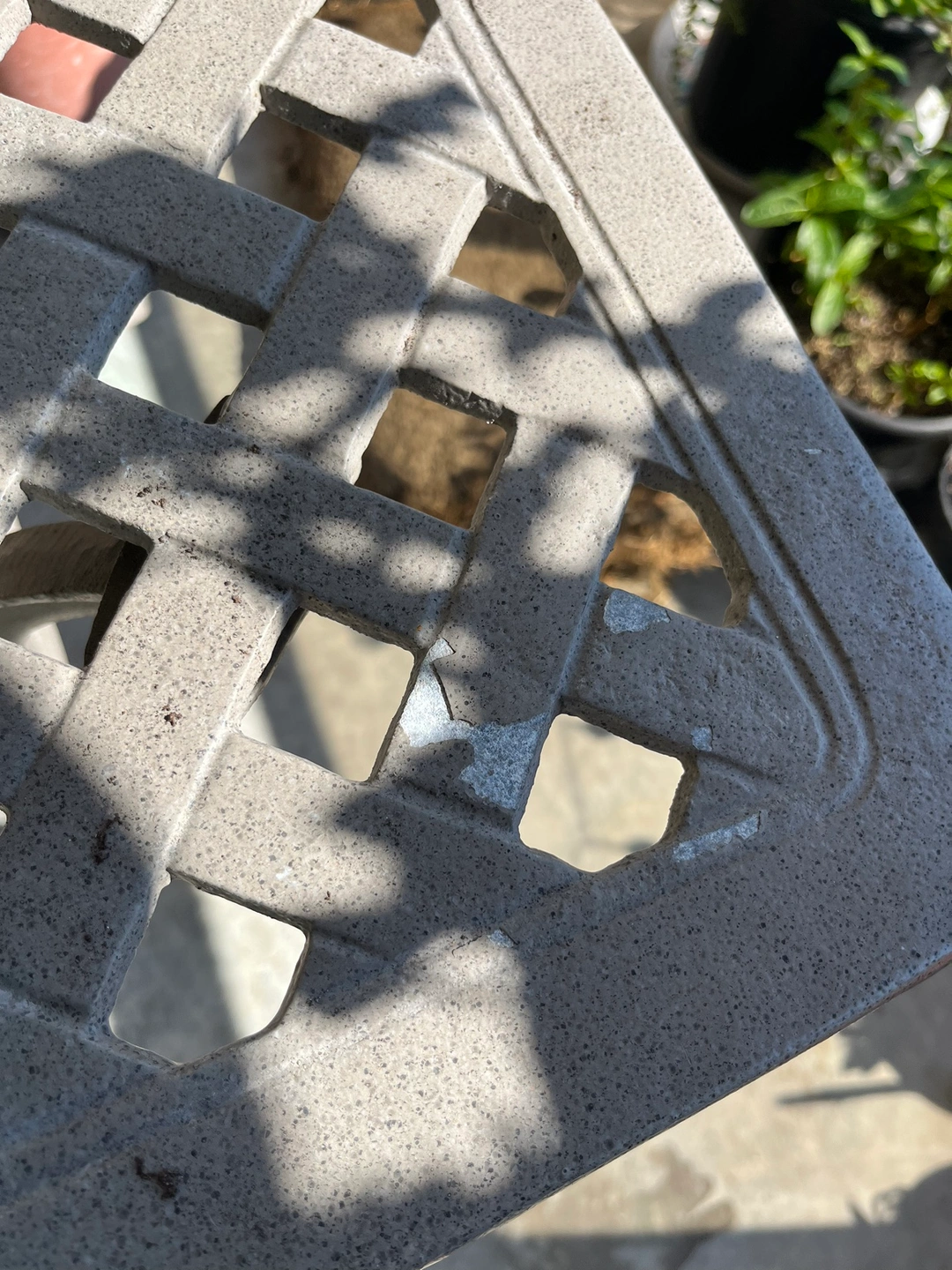 Reduced from $170 due to coating chipped at a couple of spots. Cast iron powder coated table suitable for outside size 31.5x31.5 inches height 29 inches all connected by stainless steel nut and bolts .