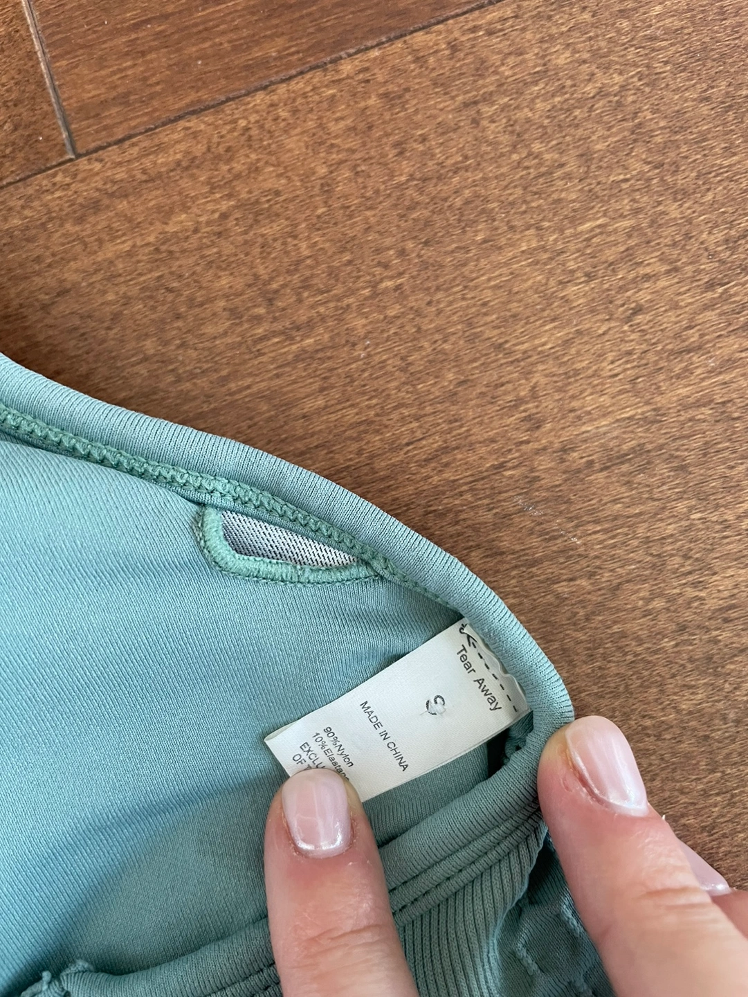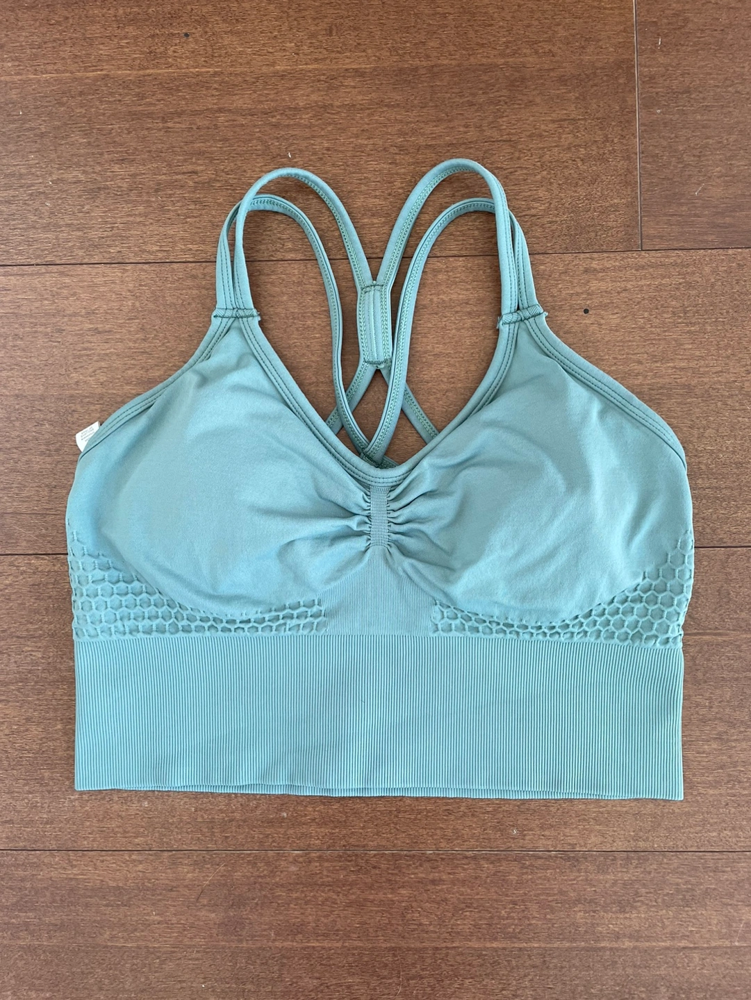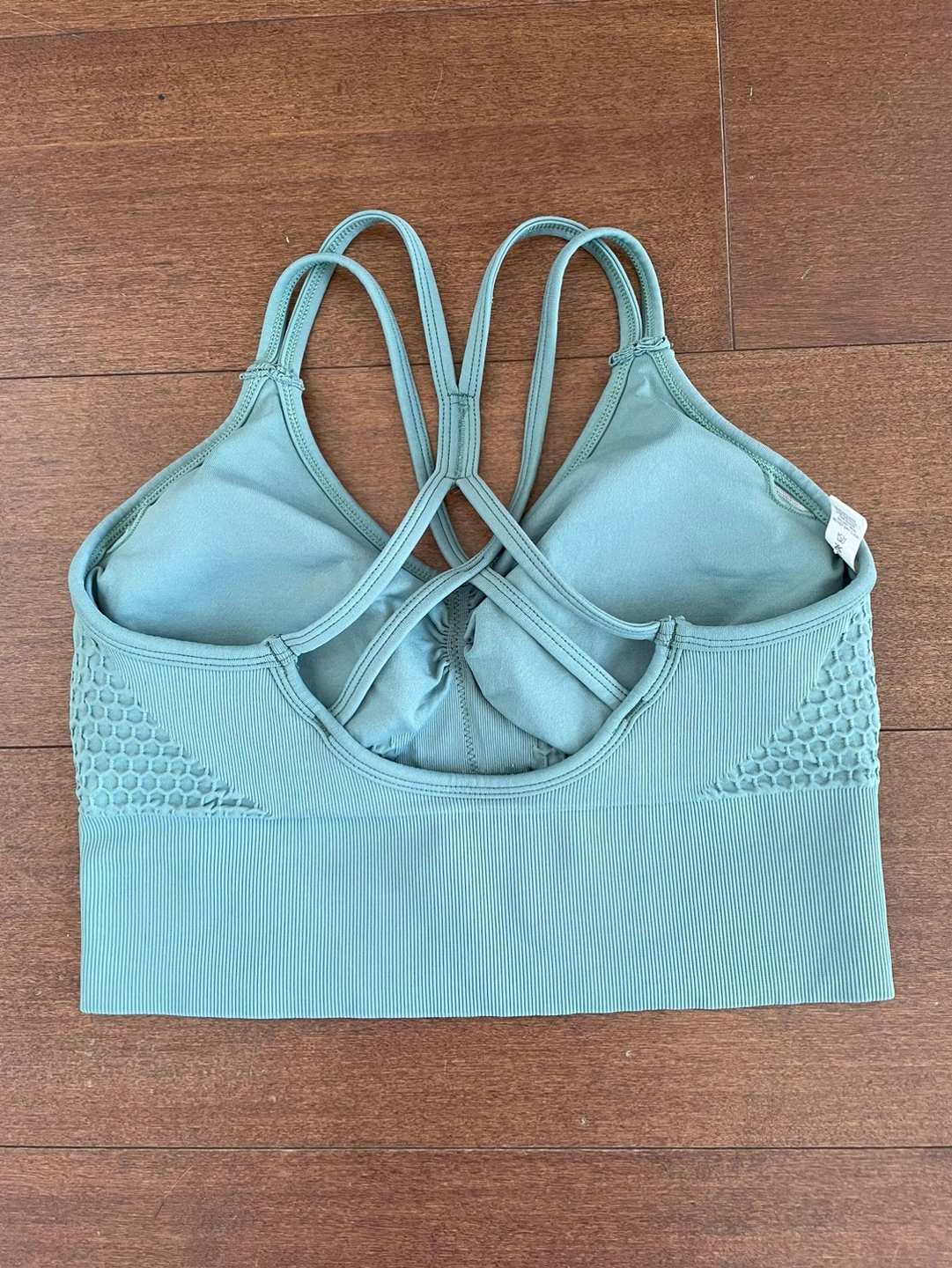 Seafoam green yoga top from Halara. In excellent condition, no flaws. With padding. Worn a handful of times but it’s been washed. Size small.