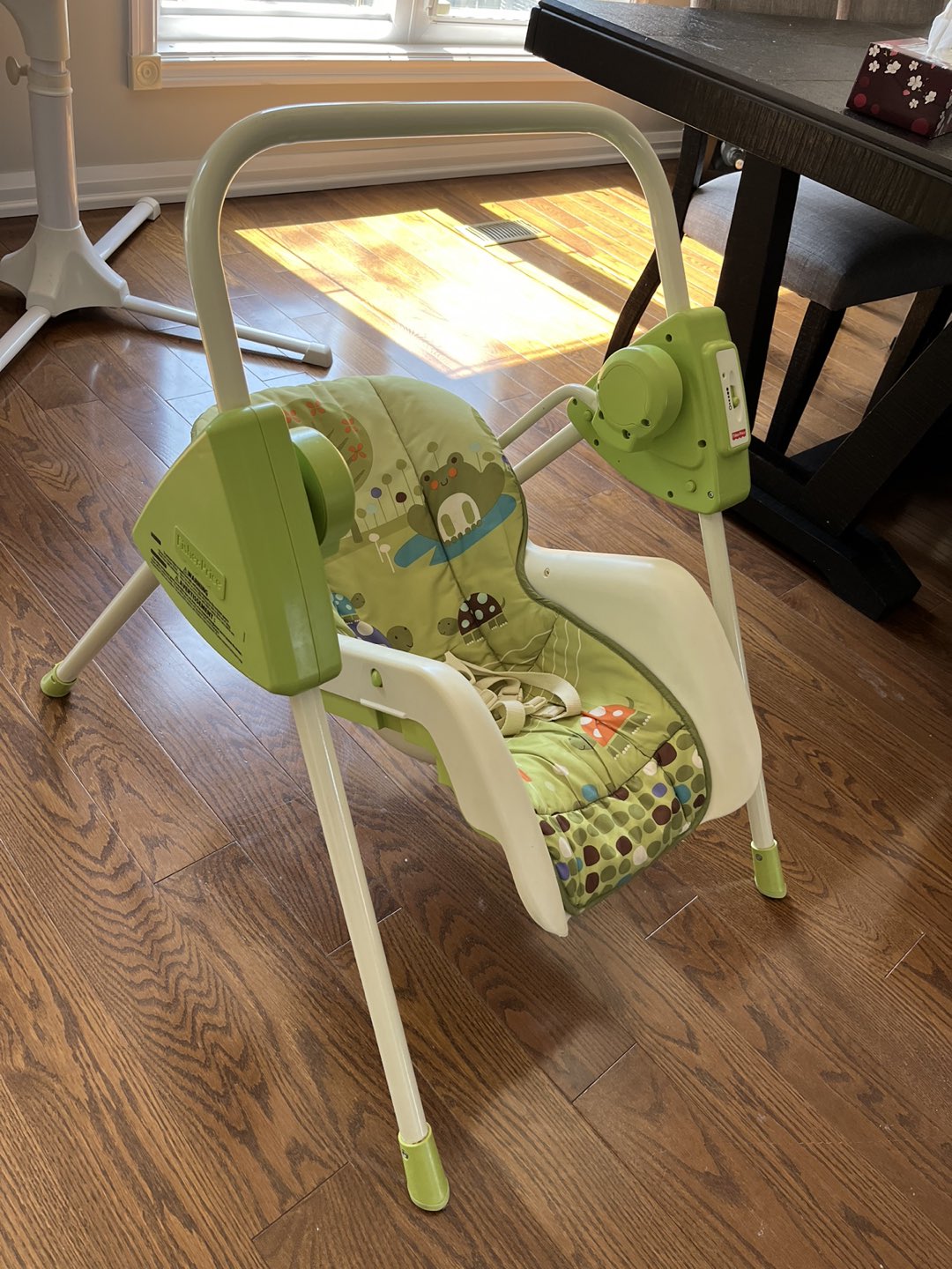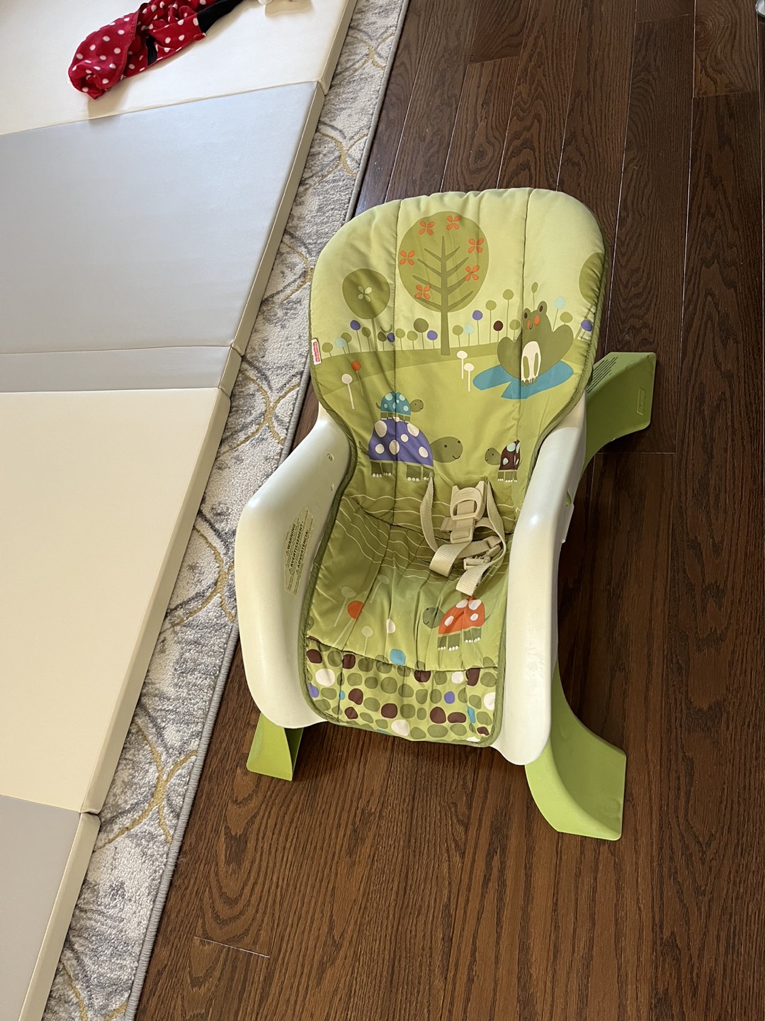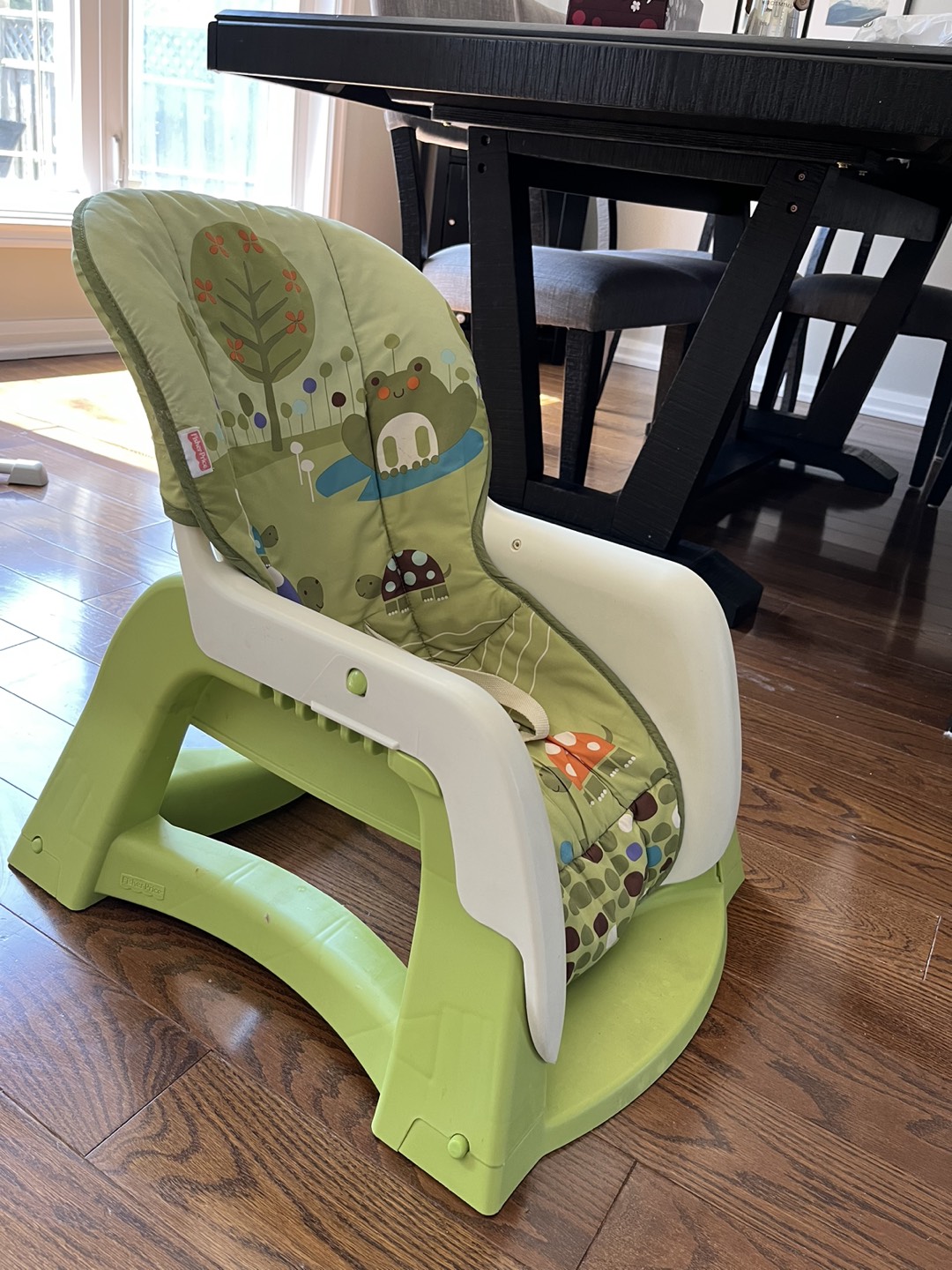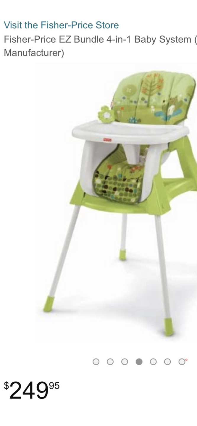 One universal seat easily fits into four different platforms. It starts as an infant seat, then can be moved to a swing with 6 different speeds, When baby is ready for feeding, it slides into a high chair, and finally can be used as a toddler chair. The chair includes a comfortable softgoods pad, that has the Nanotex coating, making it spill resistant, yet very comfortable. Snap-Fit technology makes it easy to secure each position into place.