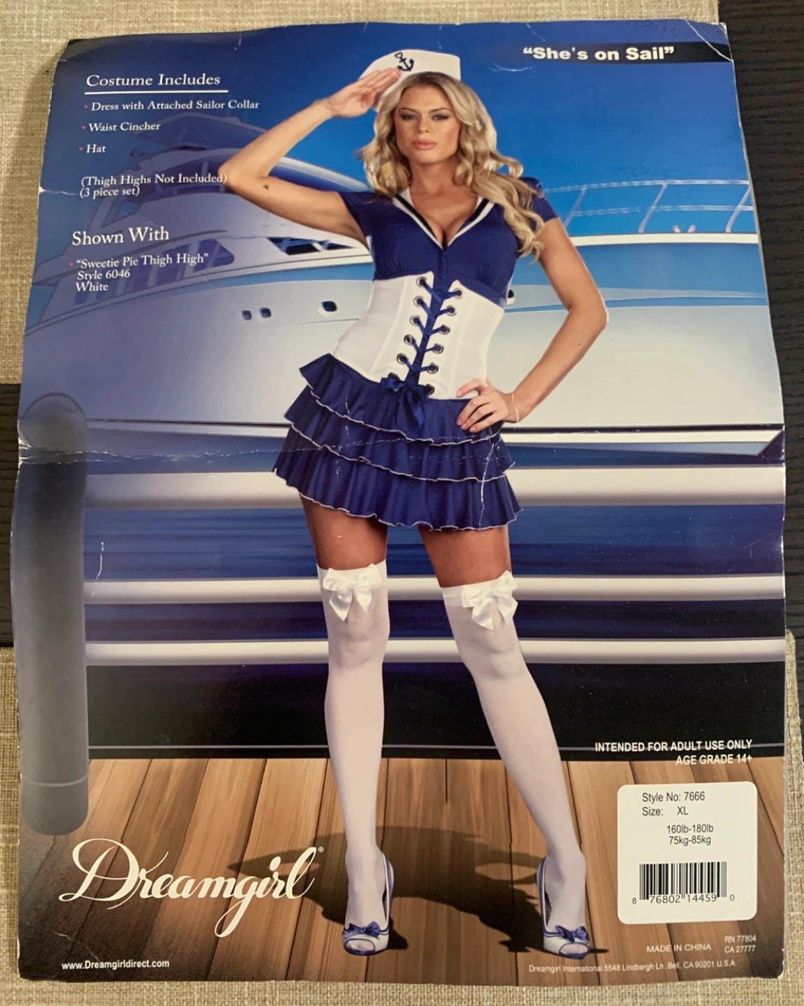 XL “She’s on Sail” costume - includes dress with attached sailor collar, waist band and hat. Includes thigh highs. Used only once, some visible wear but in good condition, washed.