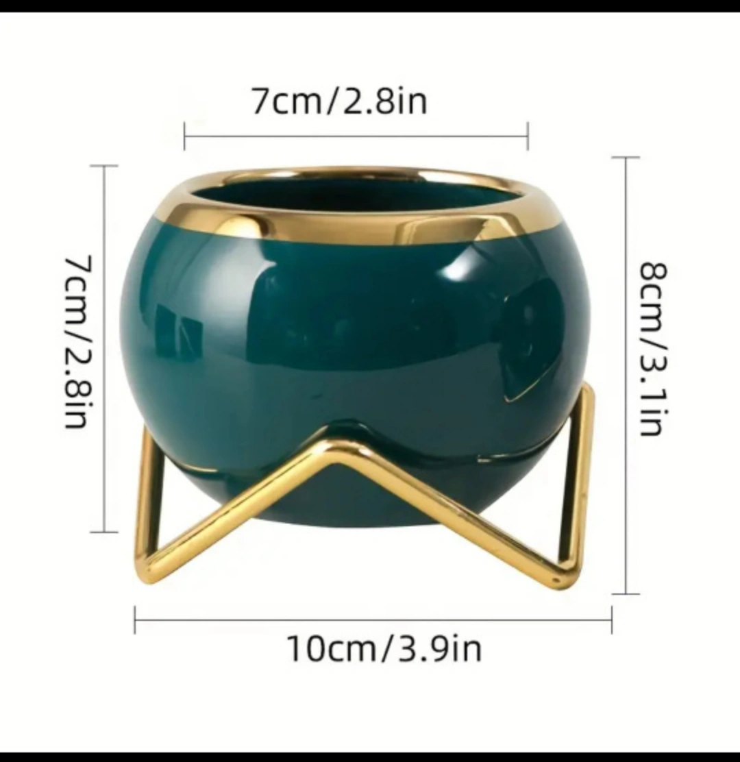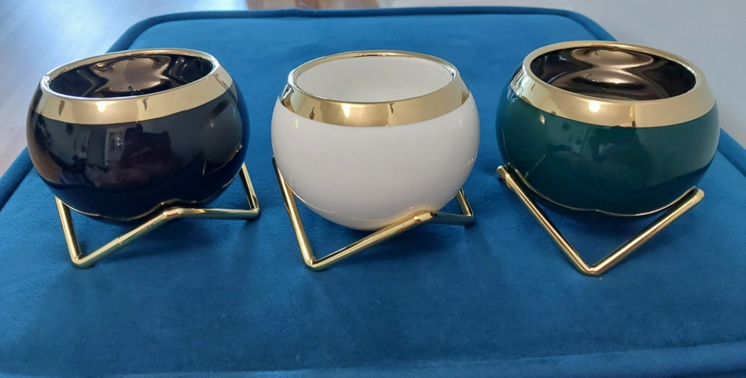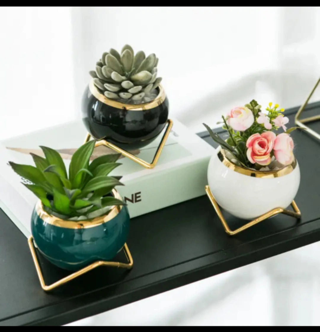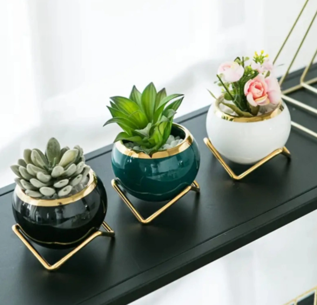 3pcs/set, Porcelain flower pots set, creative flower pots with stainless steel golden flowerpot bracket, mini plant pots suitable for Indoor & outdoor balconies, (NO PLANTS INCLUDED)