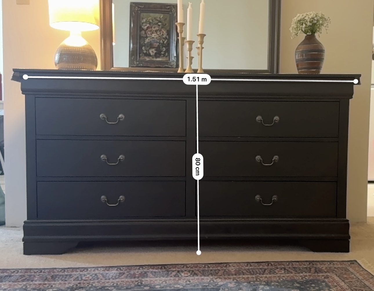The dimensions of the dresser (H*L*W): 80*150* 45 ( all are in cm)