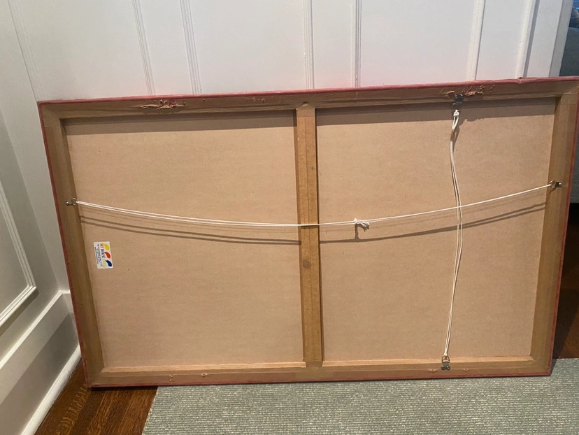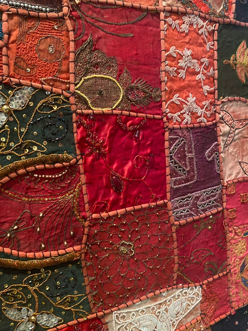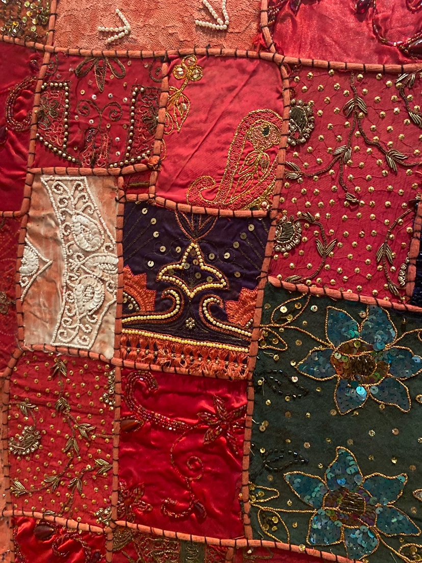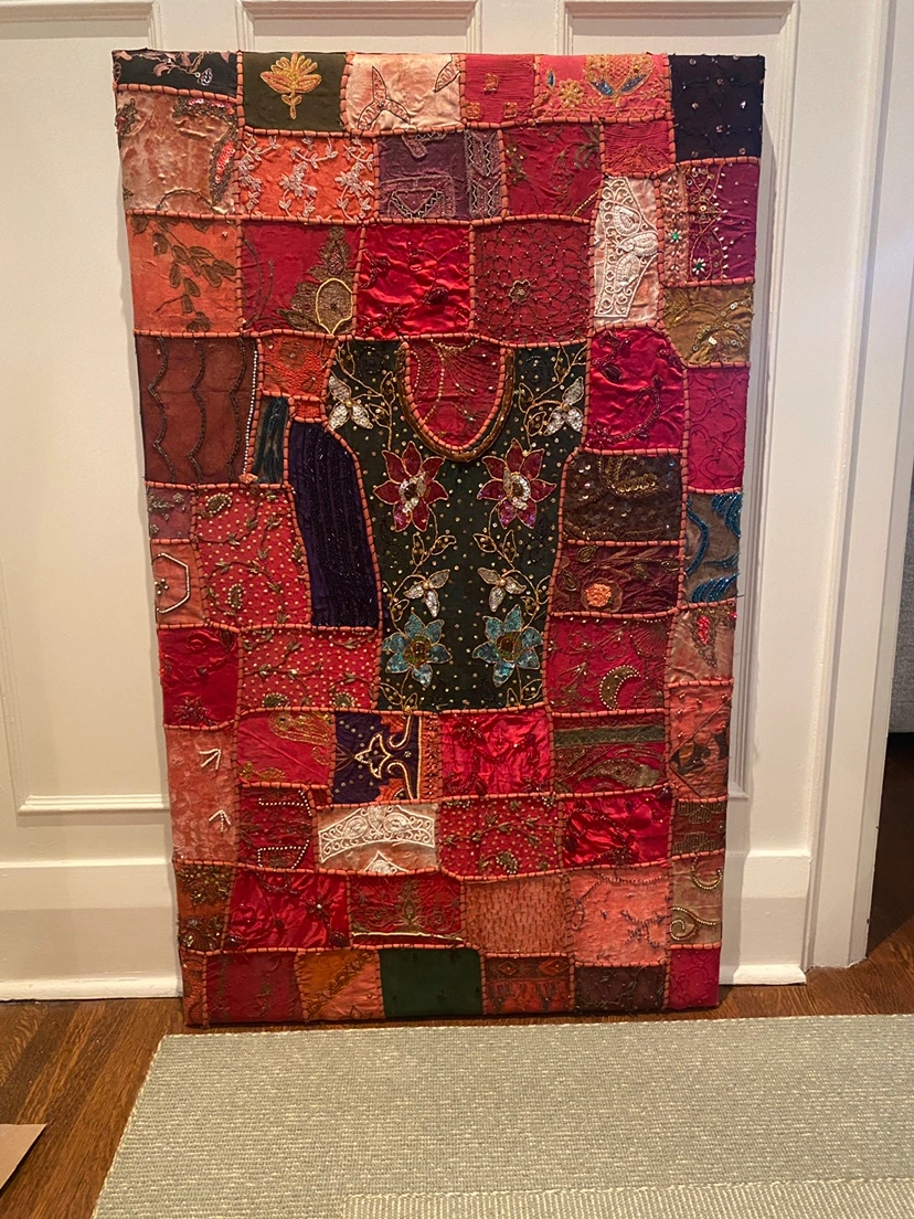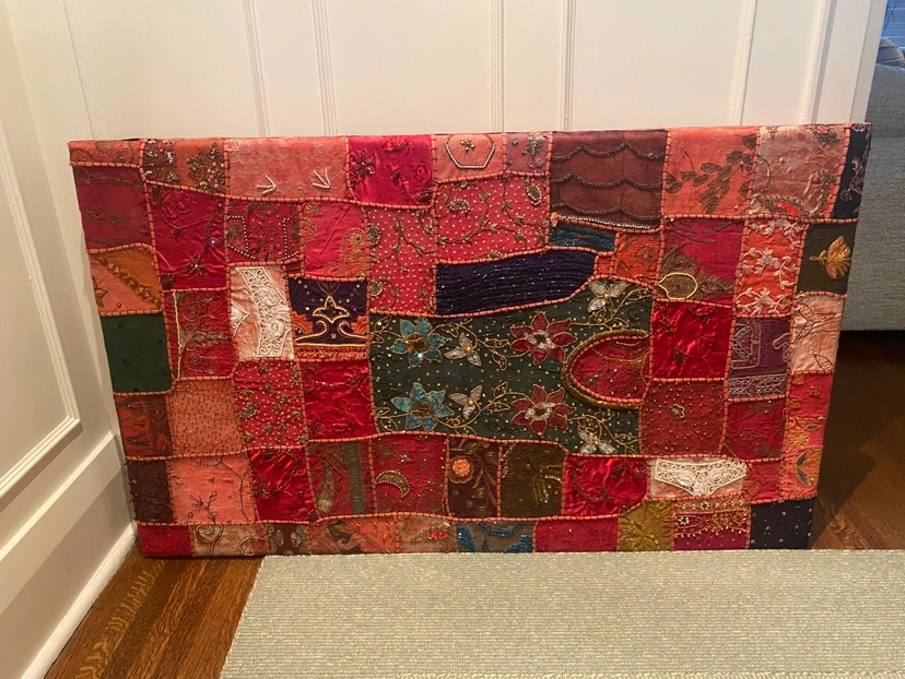 Beautiful artwork of red Indian fabric swatches. Purchased in a market in Dubai then professionally stretched on canvas. Gorgeous craftsmanship! Can be hung vertically or horizontally.