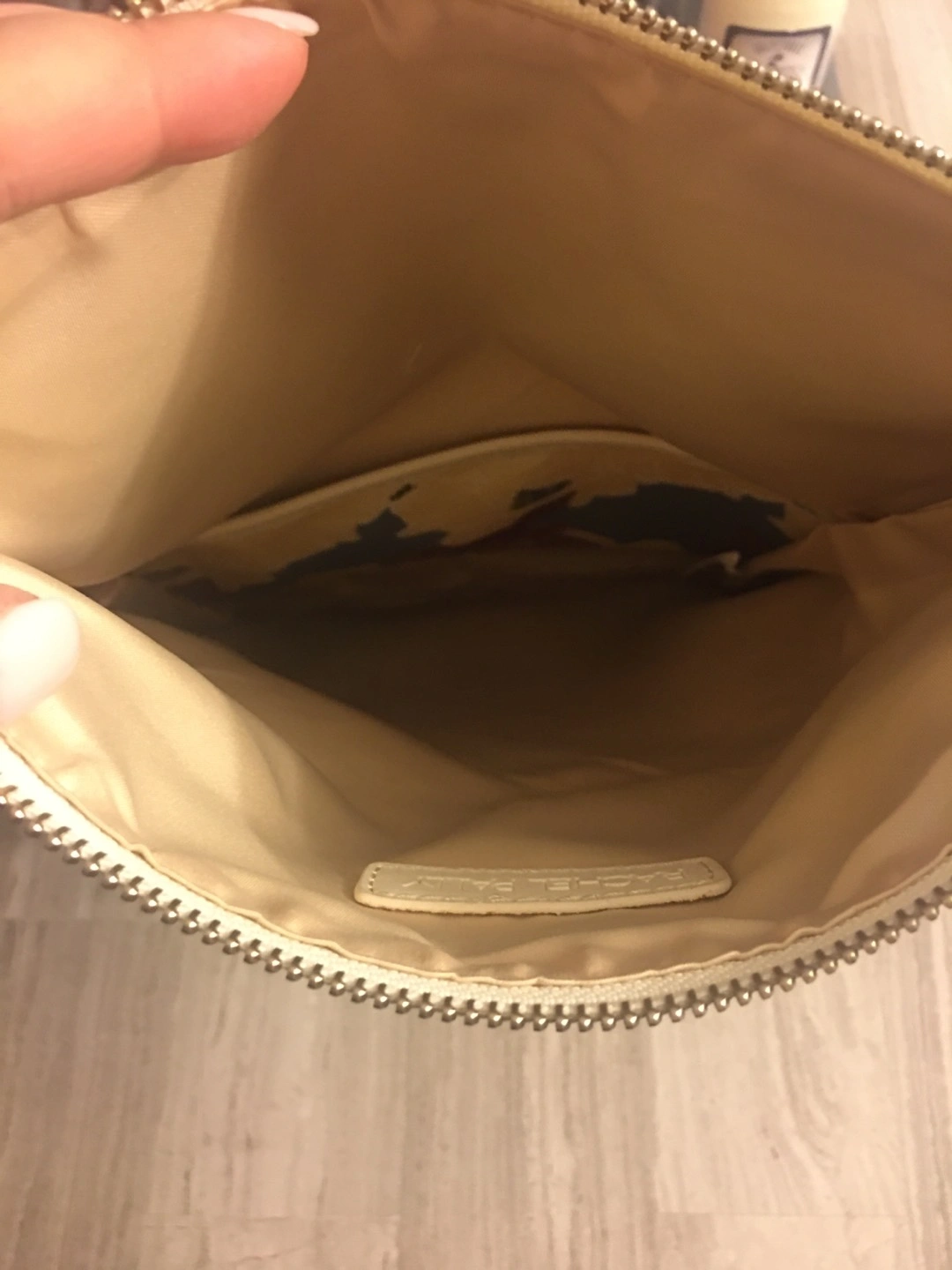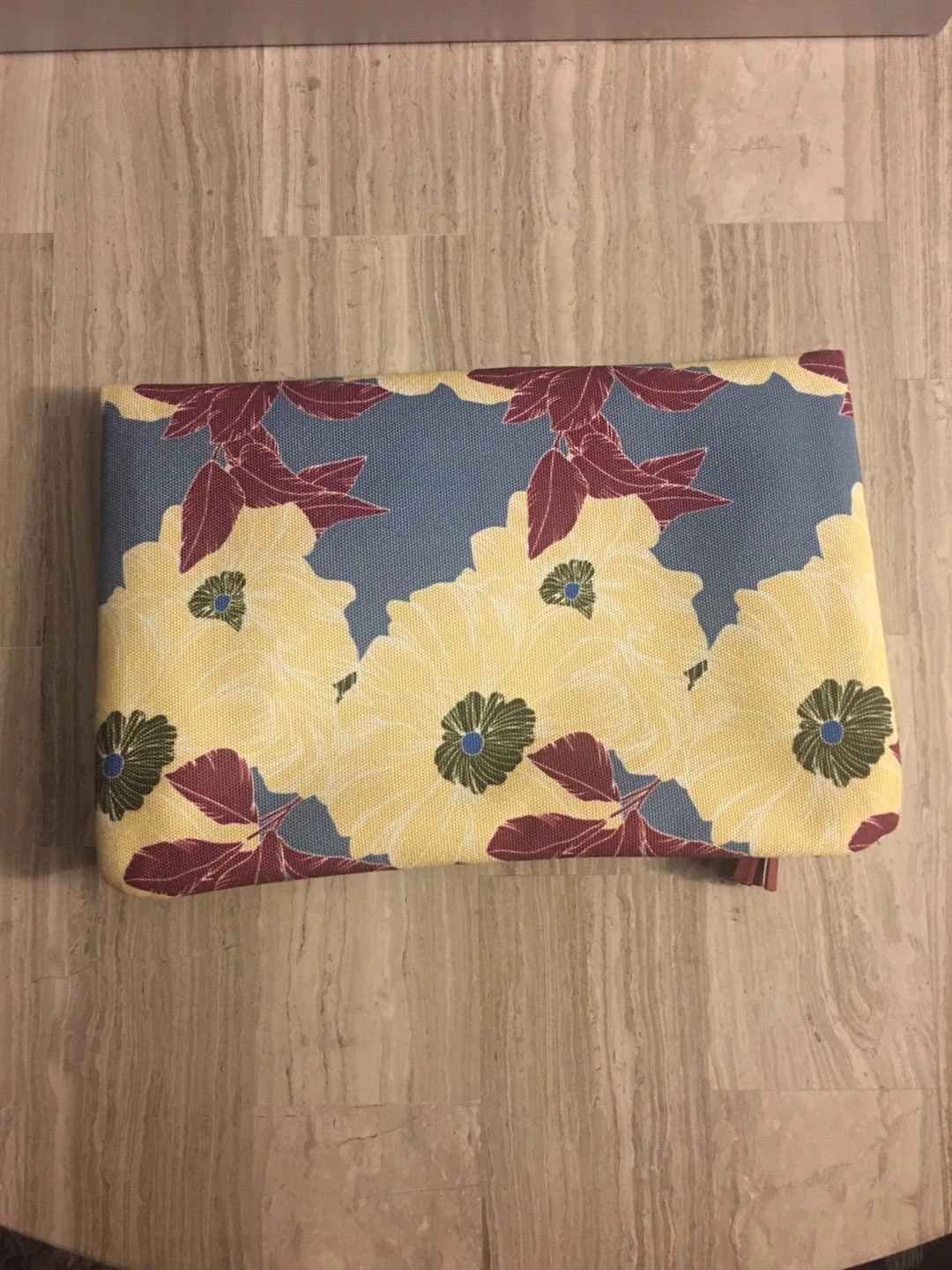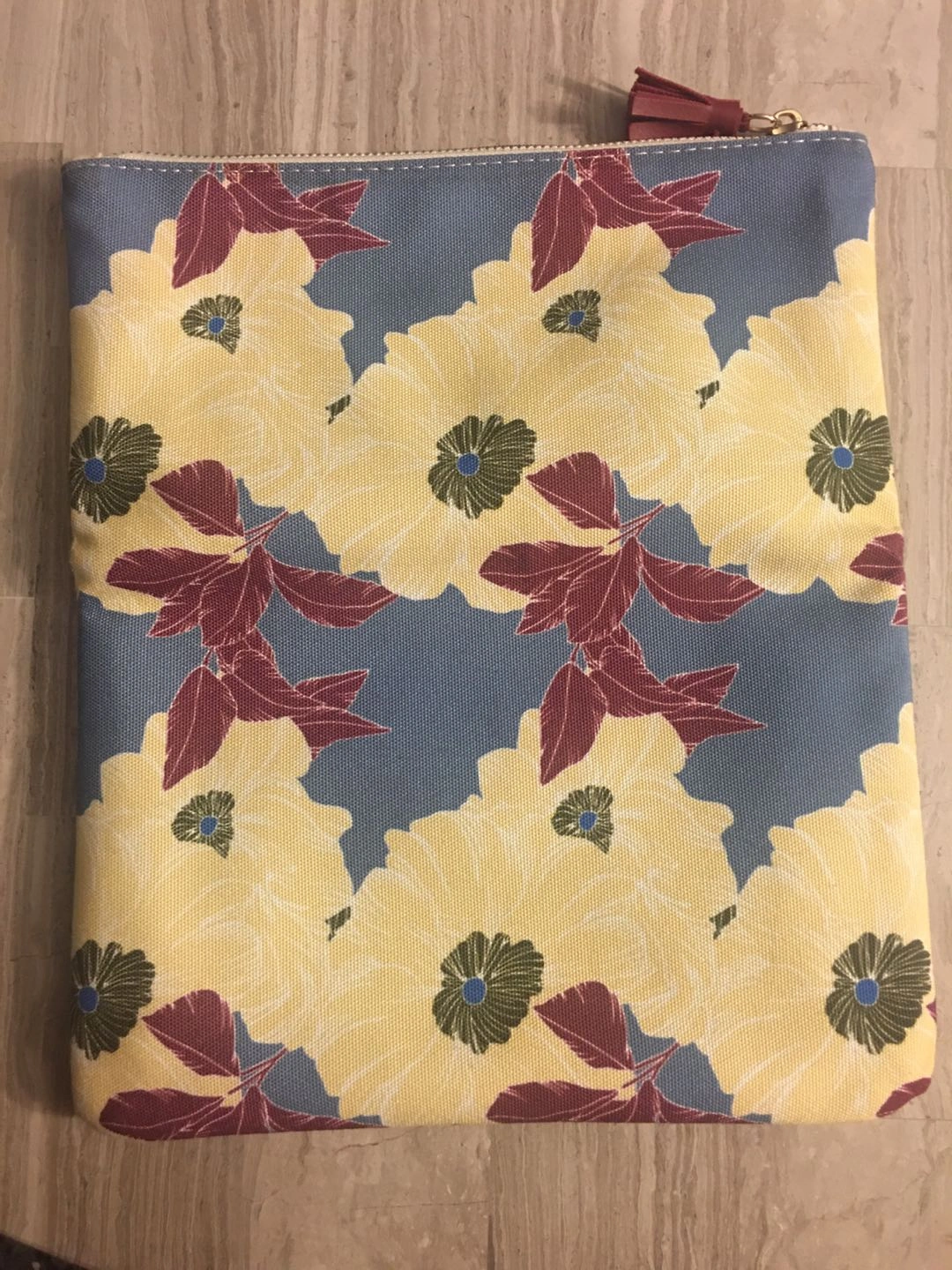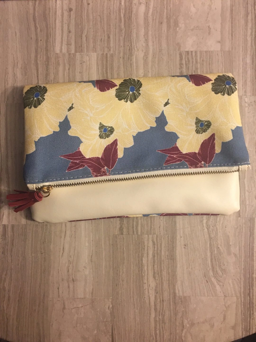 This is a reversible fold-over clutch that is cream coloured faux leather on one side and a tropical floral print fabric on the other. New without tags.