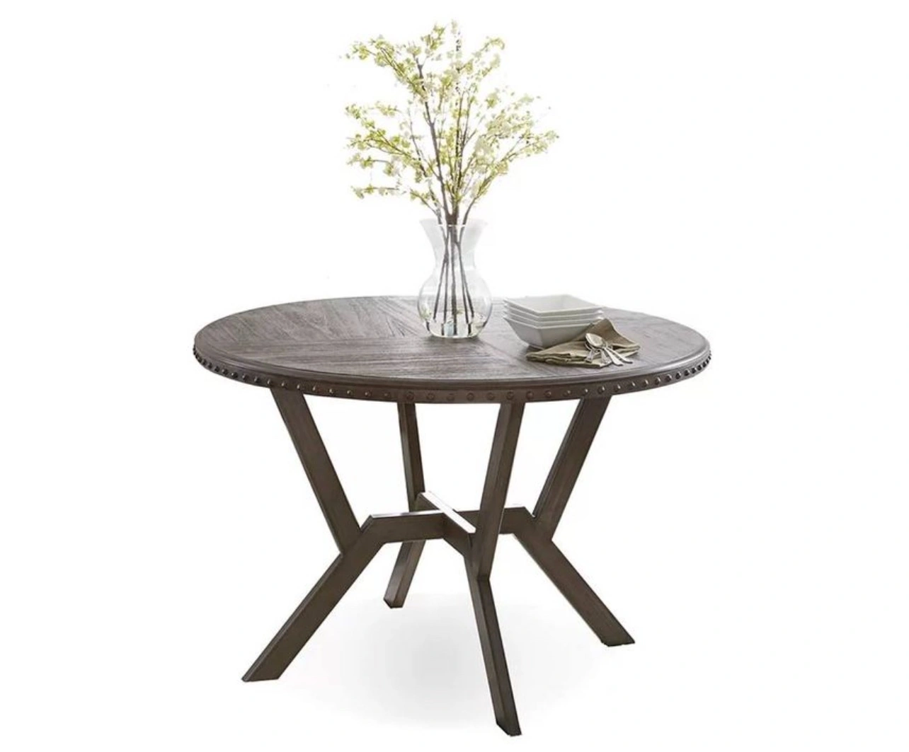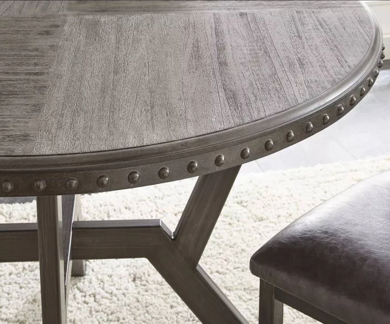 Beautiful parquet veneered tabletop in a gray wire brushed finish features decorative nailhead accents