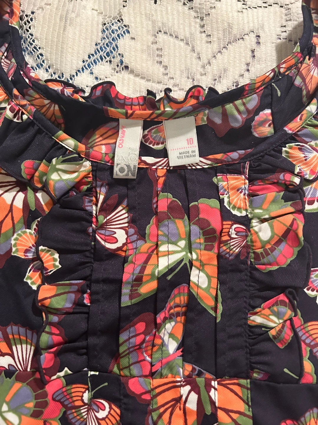 This is a Lalique girls' dress with a colourful butterfly print. It's a size 10 and made in Vietnam. Features ruffled trim along the neckline and straps.
