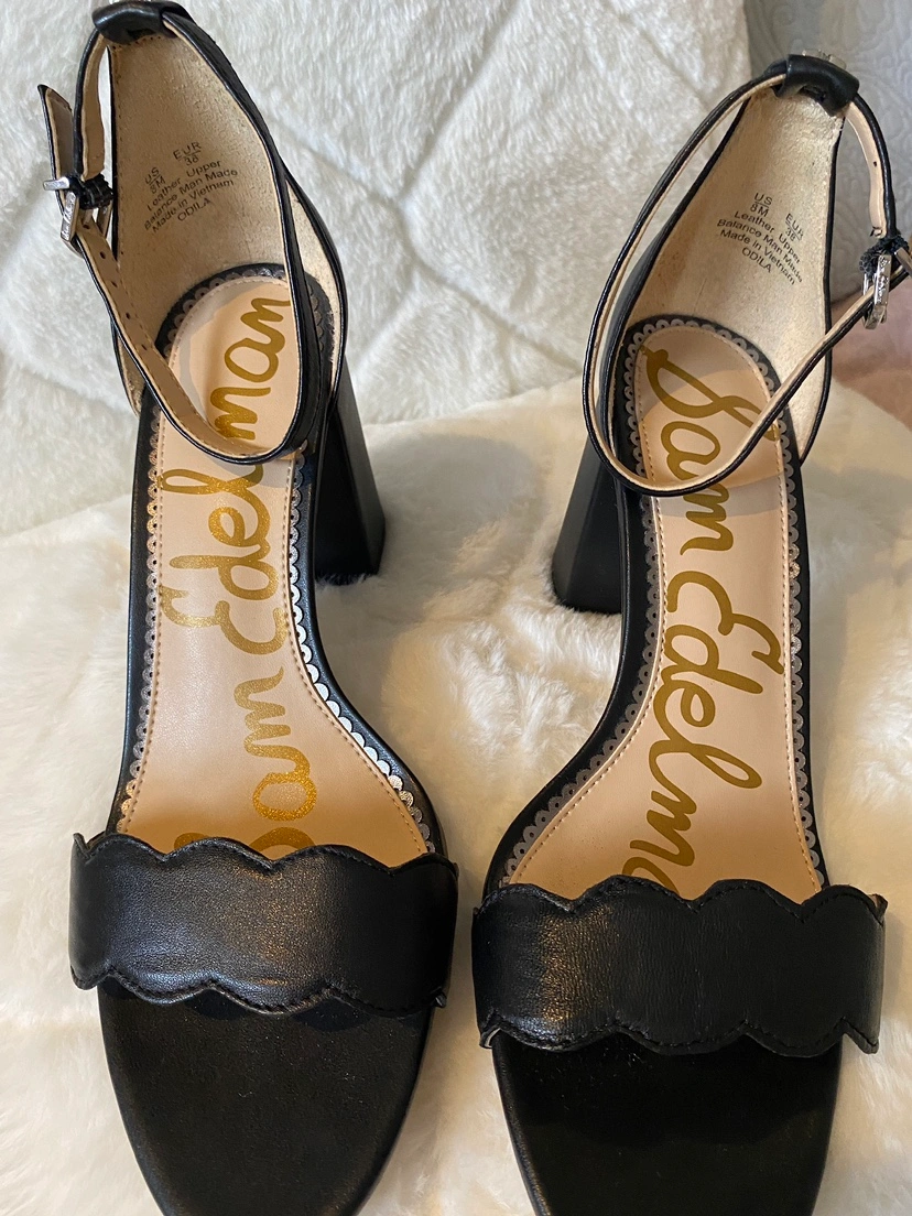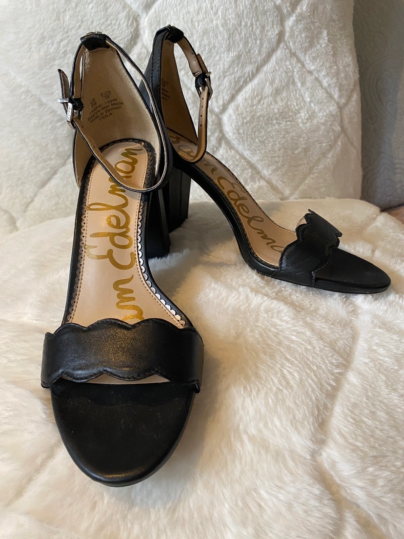 Sam Edelman Odila Black Heels with a scalloped leather toe strap. Size 8.5. Adjustable ankle strap. Block heel at a 3" height.