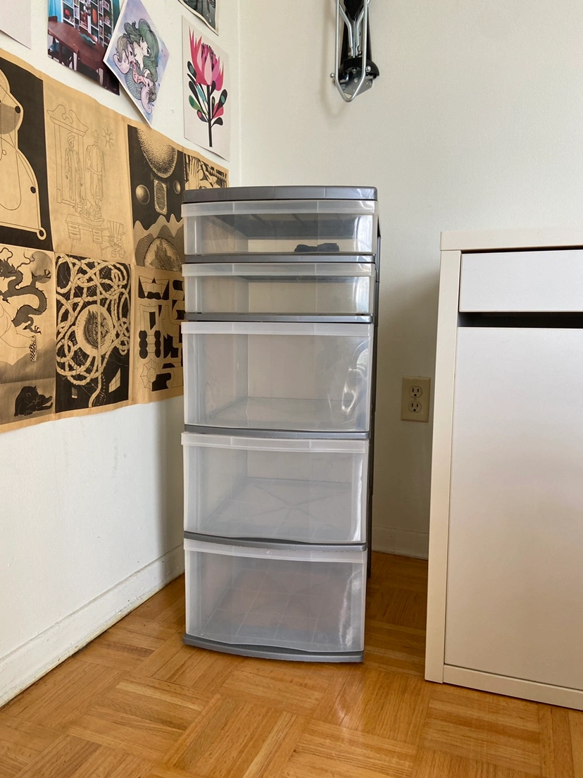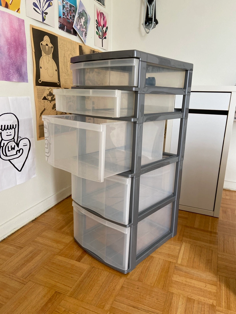 - Clear plastic storage drawers