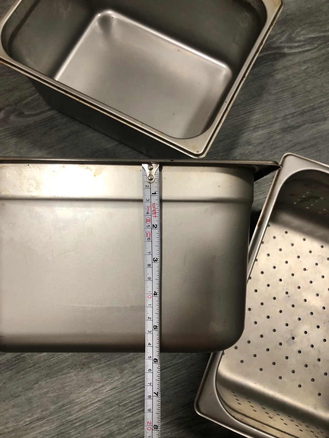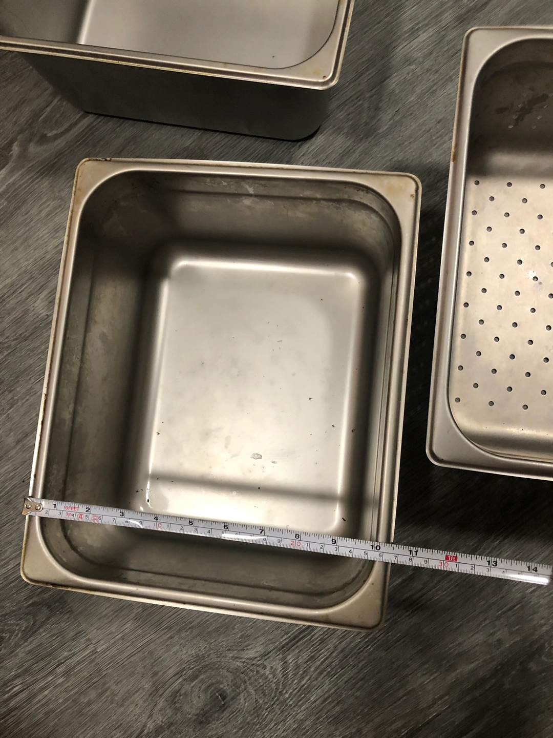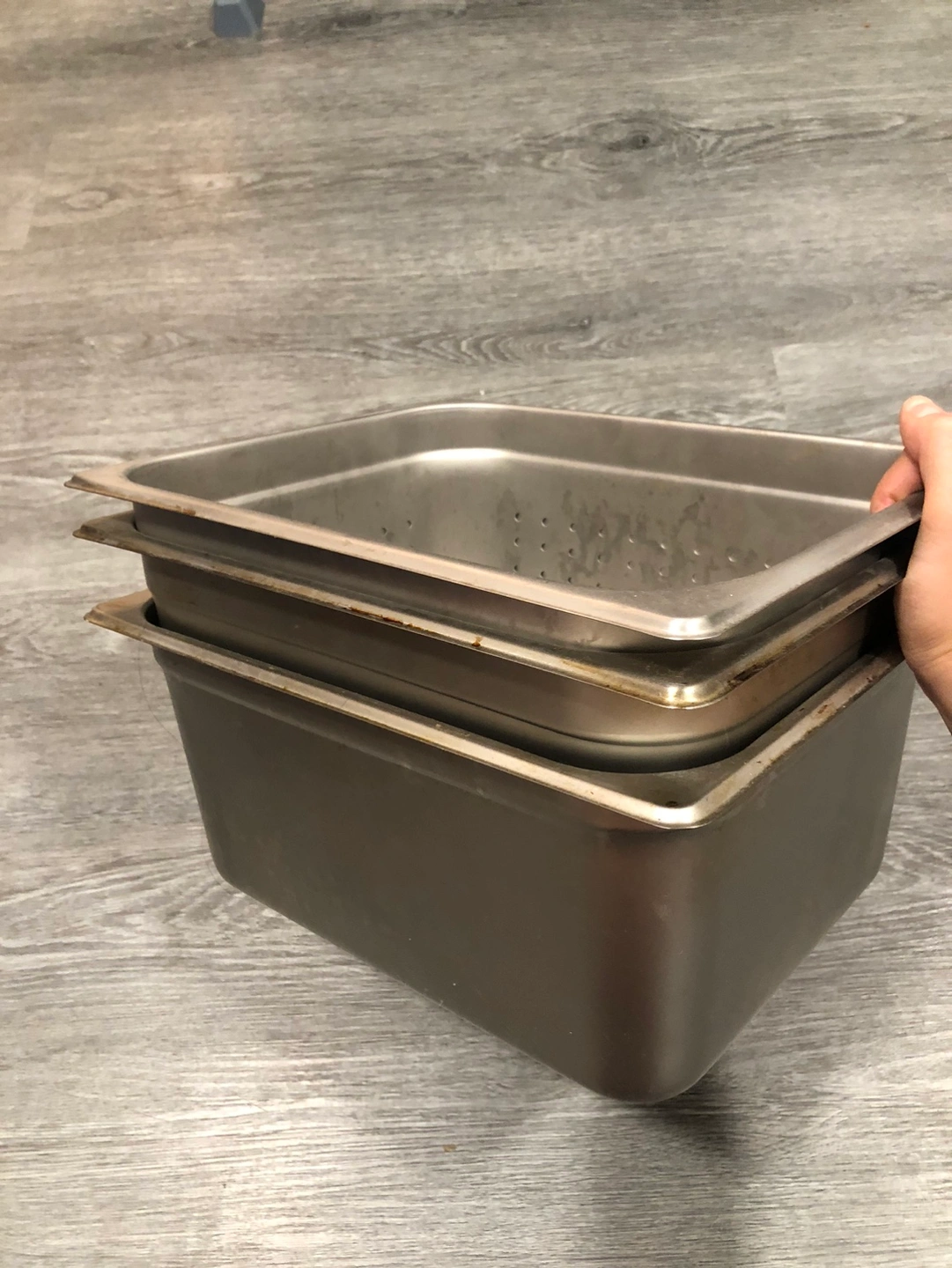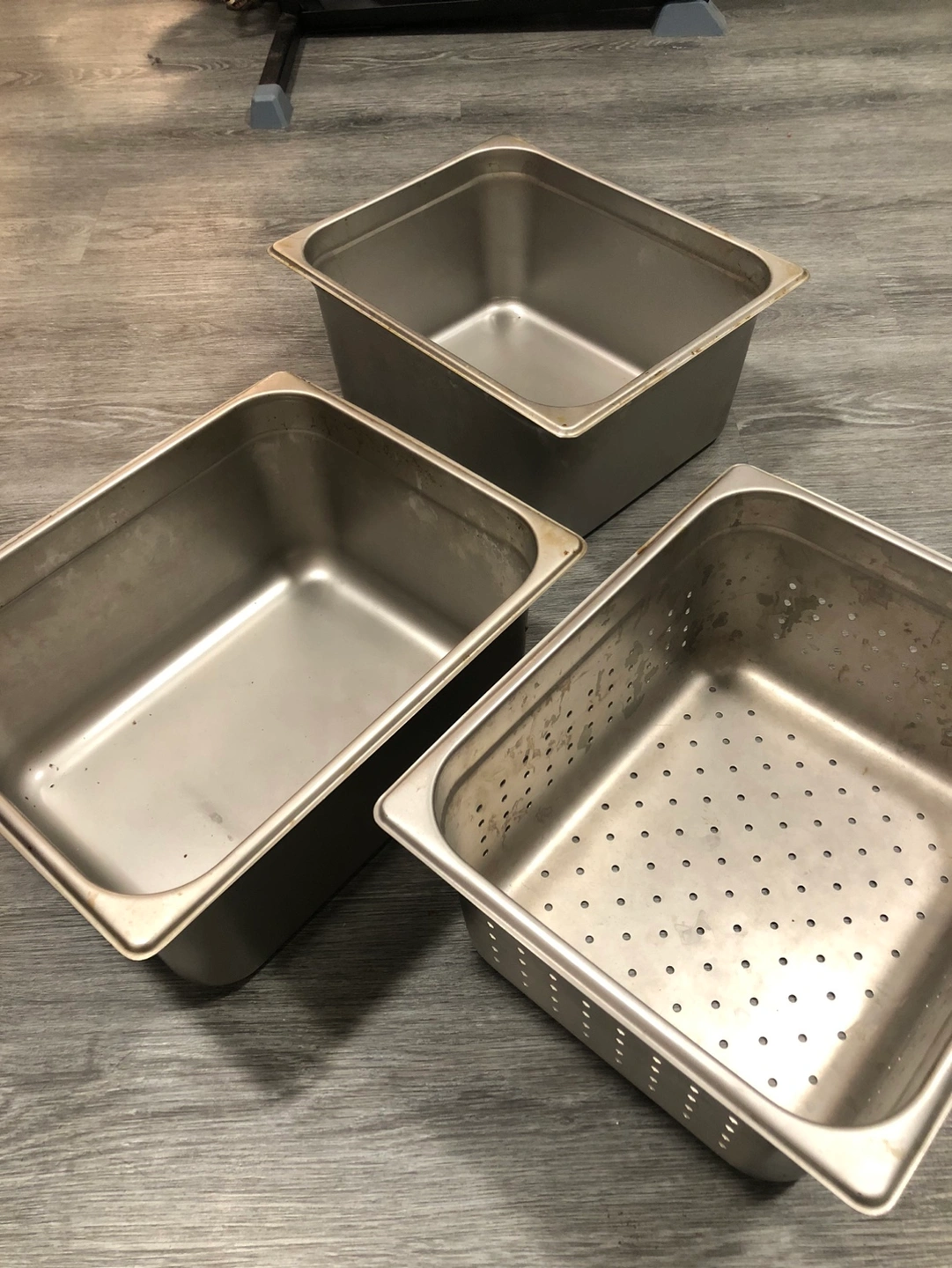 Commercial kitchen stainless steel steam pans, half size and 6” deep. They nest together well and have no functional flaws.