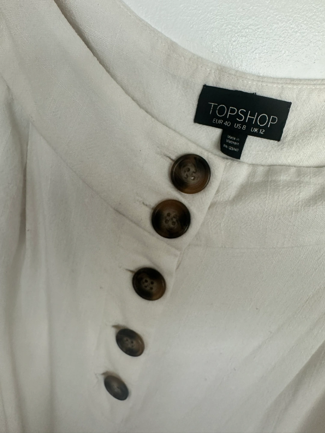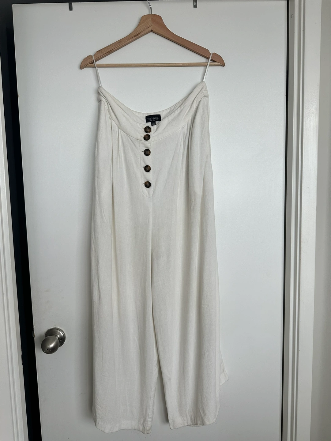 White wide leg viscose, linen, nylon blend pants. From Top Shop. Very breathable with brown button detailing. Shows size 8. But shrunk in the wash. So closer to a 6 now. Loved these pants to elevate my look in the summer. But I now can’t wear them without getting some extra rolls at my waist. 🥲