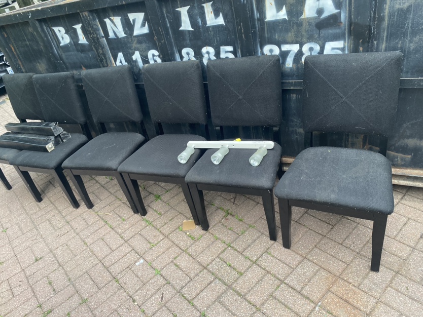 Standard dining room set size, beautiful black wood lace with glass top and with 6 black cloth chairs In good condition, has seen a lot of family dinners and good times