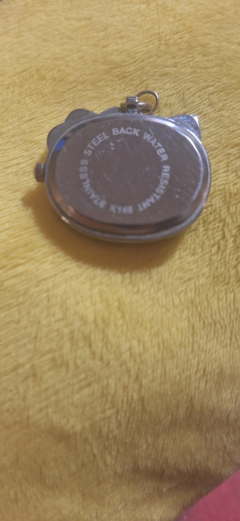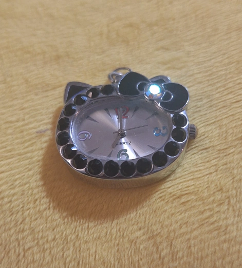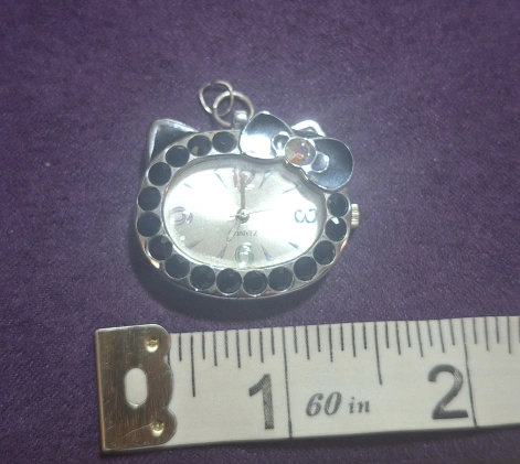 Unique 'Hello Kitty' look with black crystals. This pendant is a watch. Worked fine - battery needs to be replaced. Always got compliments on its uniqueness. From a pet-free/smoke-free home.