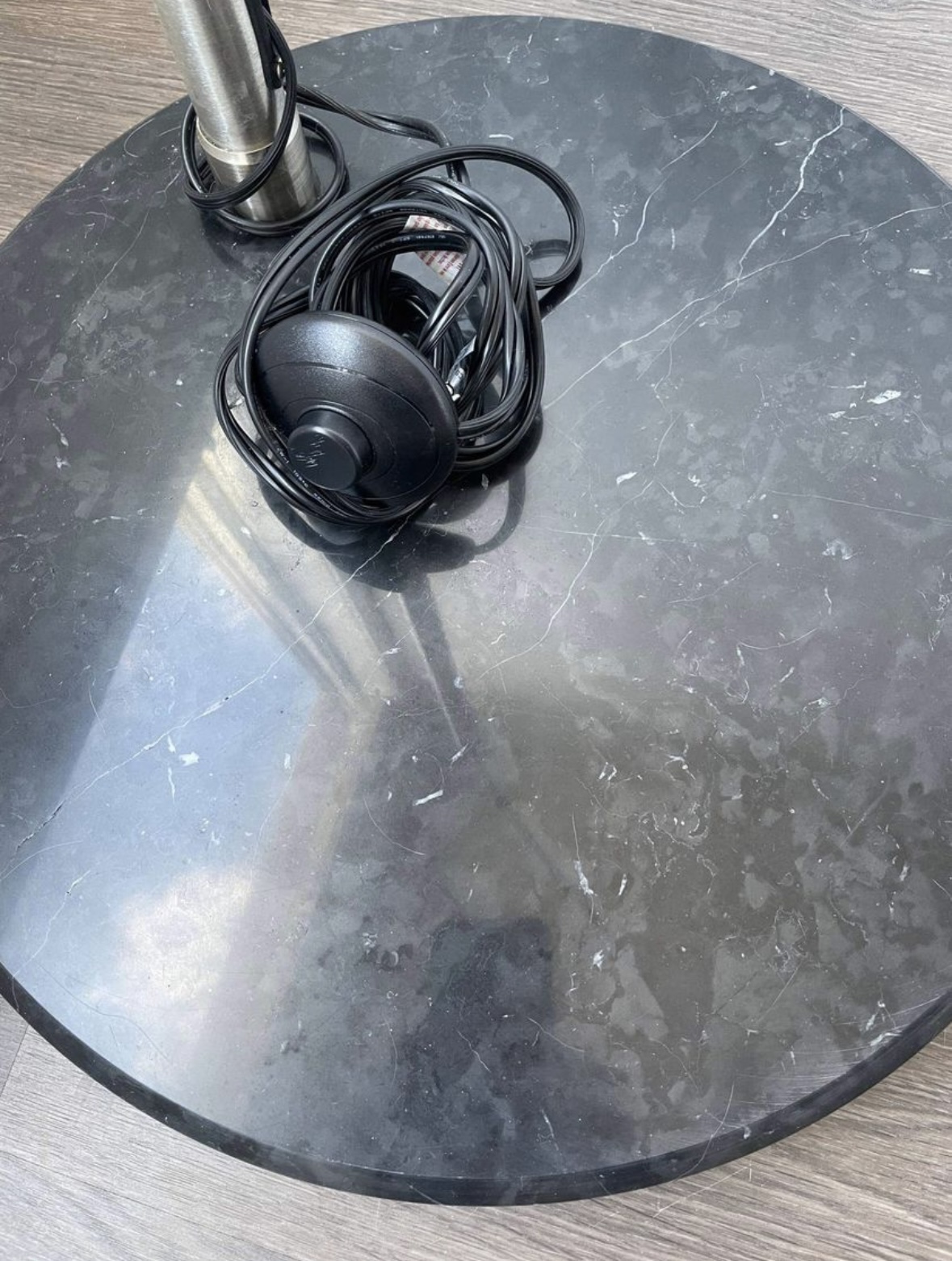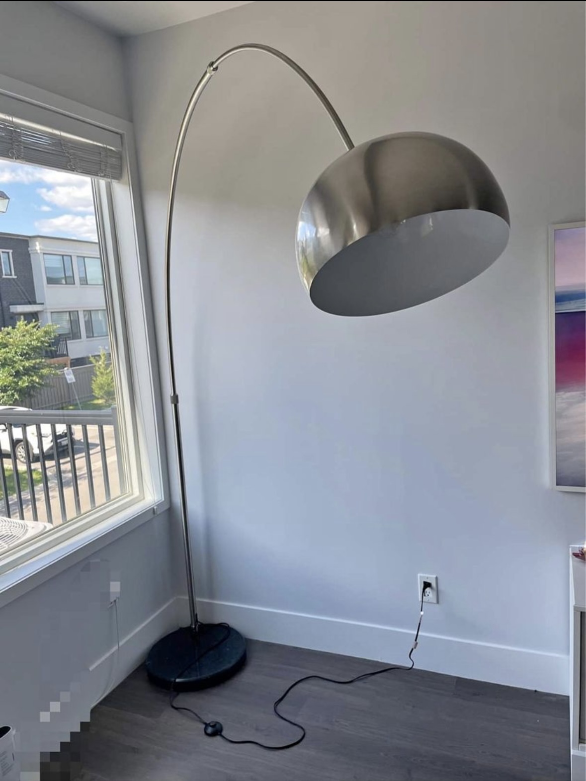 41Arched Floor Lamp with Heavy Marble Base • Way too big for my space and wasn’t what I envisioned ** pictures are from previous owner, since it’s too big for my own space I never put it up ** • Lamp is in perfect condition, can be collapsed/disassembled Measurements - Height: 213 cm (84”) Length: 175 cm (69”) Shade Diameter: 42 cm (17”) Base Diameter: 48cm (19”) Cord Length: 2.0m (7”)