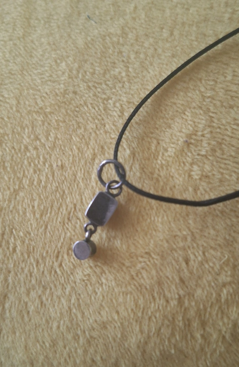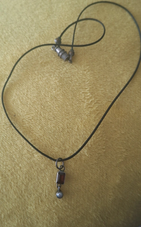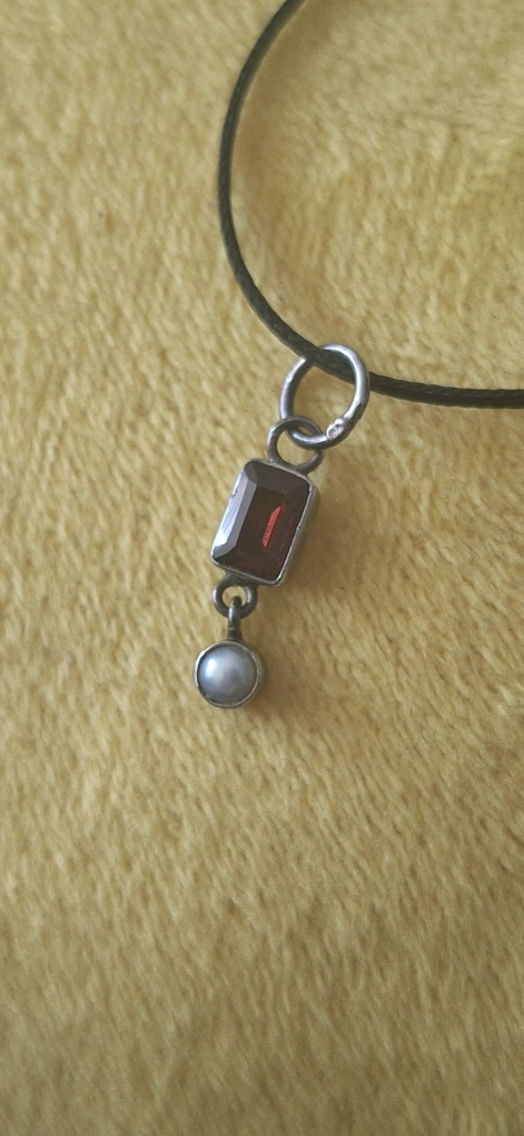 Sterling silver casing for a small, rectangular ruby red glass and pearl pendant. No longer my style.