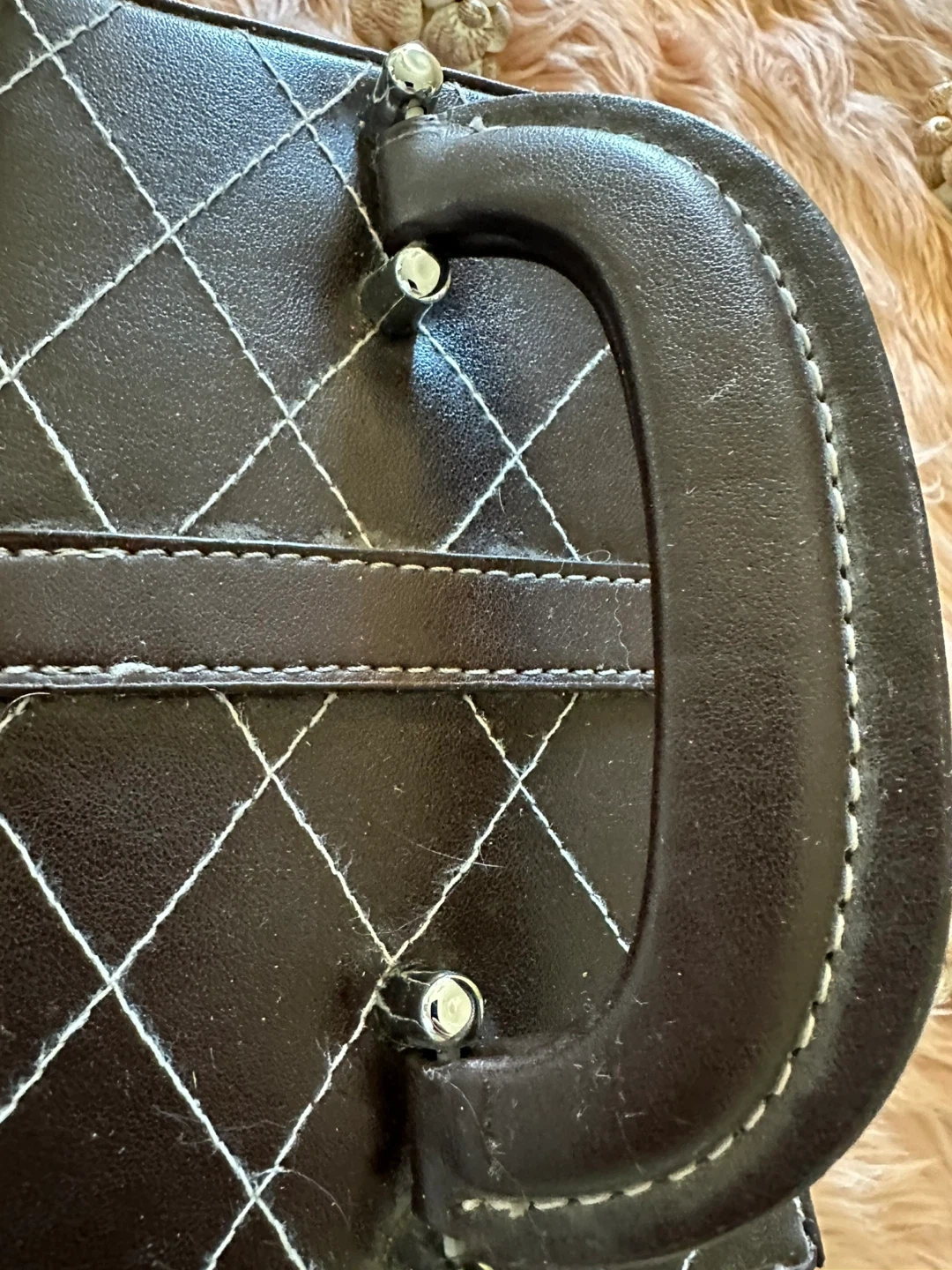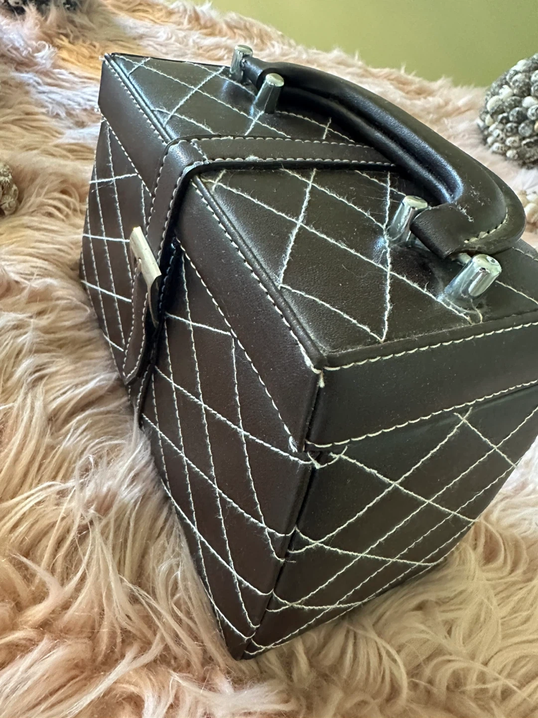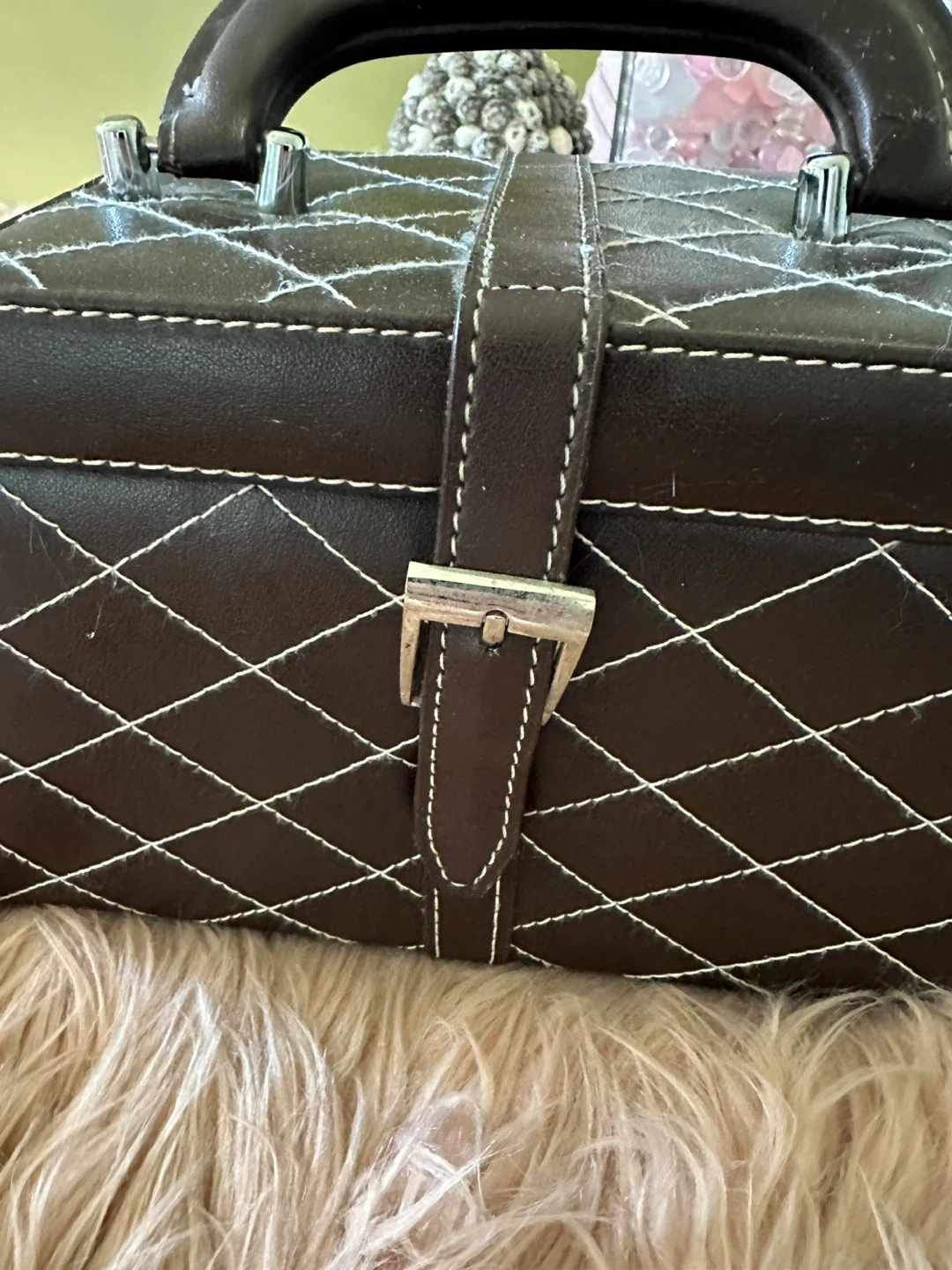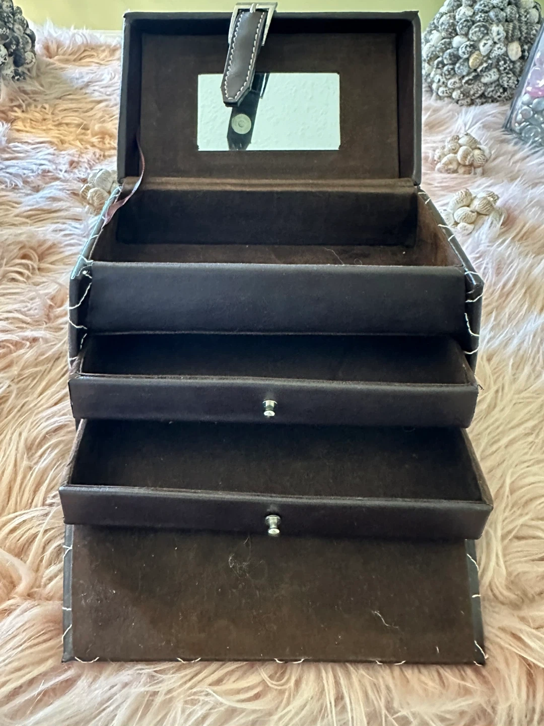 Brown faux-leather quilted jewelry/trinket box with white contrast stitching and silver-tone hardware. Compact size approximately 6 in (15 cm) wide, 4 in (10 cm) deep, and 6 in (15 cm) tall with handle. Secure buckle-style front strap and sturdy top handle make it easy to carry. Inside features a mirror in the lid and three pull-out, felt-lined tiers for organizing rings, earrings, bracelets, or other small items. Gently used condition with minor wear on the exterior edges but fully functional and clean inside, perfect for travel or dresser-top storage.