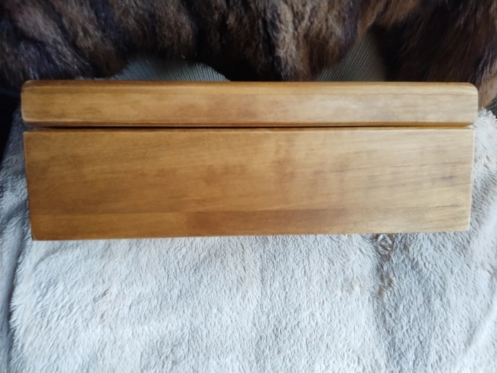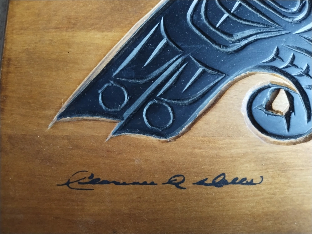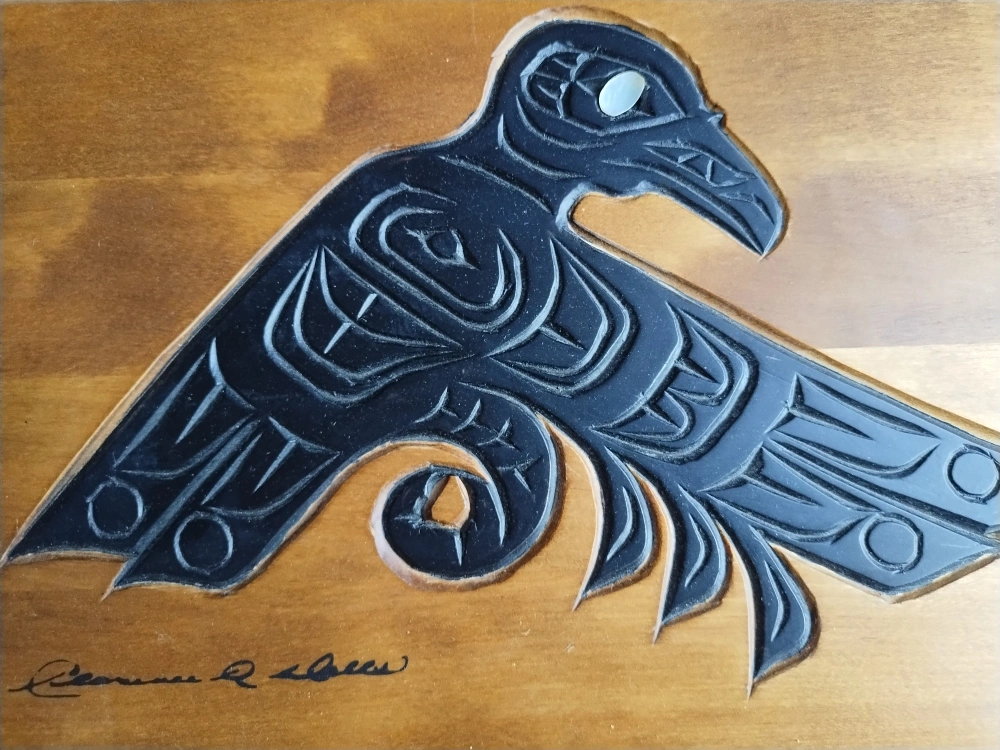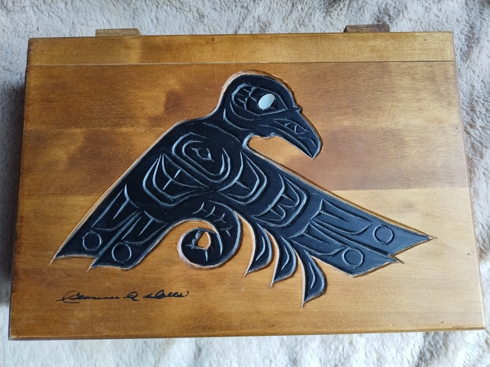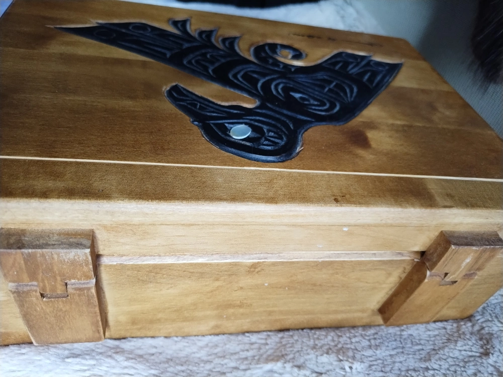 wooden hinges, Raven design, mother of pearl eye, signed by the artist.