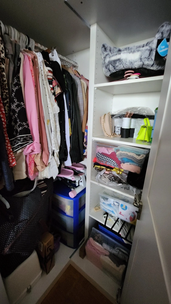 Very large and spacious interior with two clothing rods and adjustable shelves.