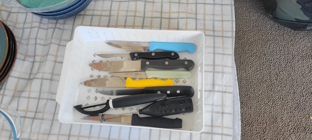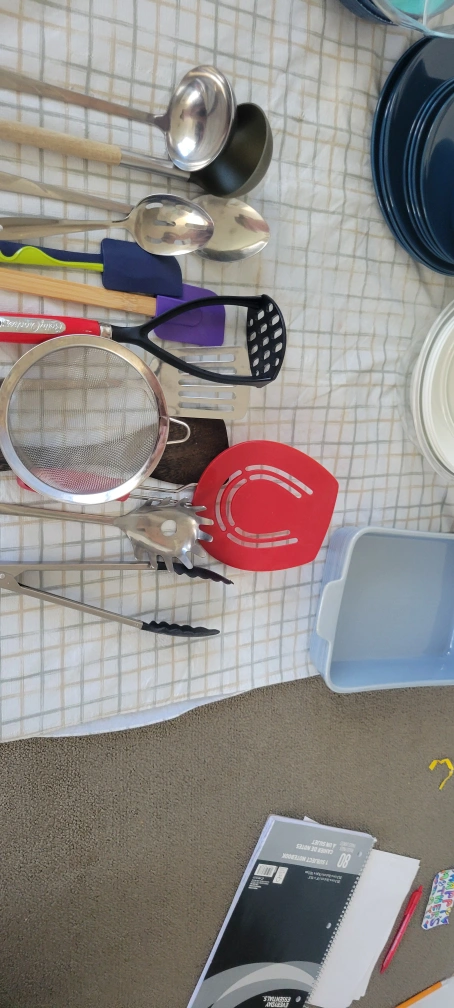 moving items priced to sell. I will make a deal when several items are picked knives 15$ Roasting pan 7$ cooking utensils 13$ salad bowls-5$ navy colors 12 piece dinner set 20$ oven dishes 5$ each