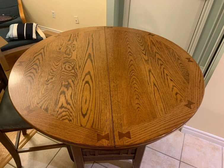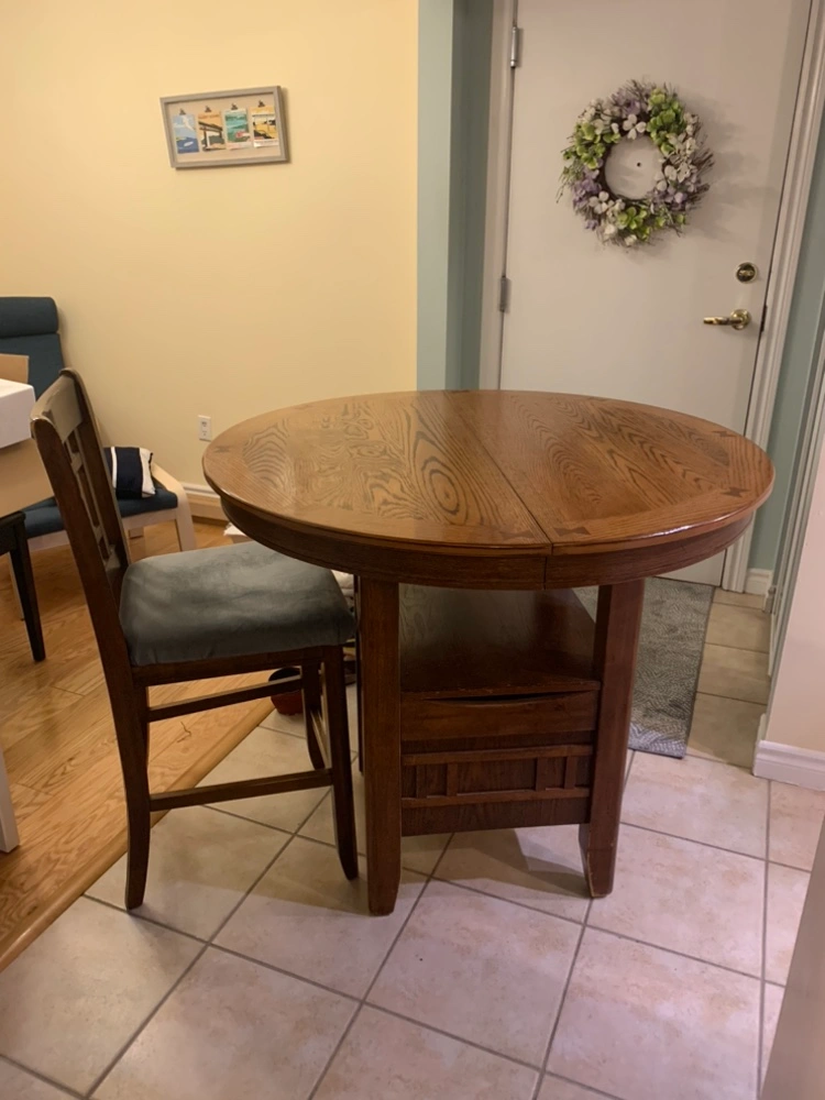 Bar height (3 feet tall) wooden table with a walnut stain finish.