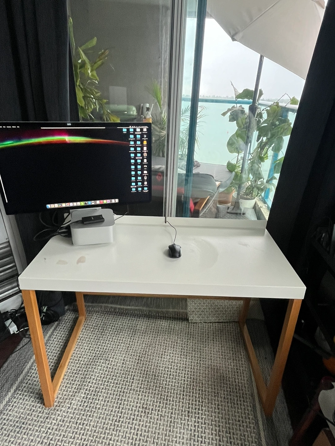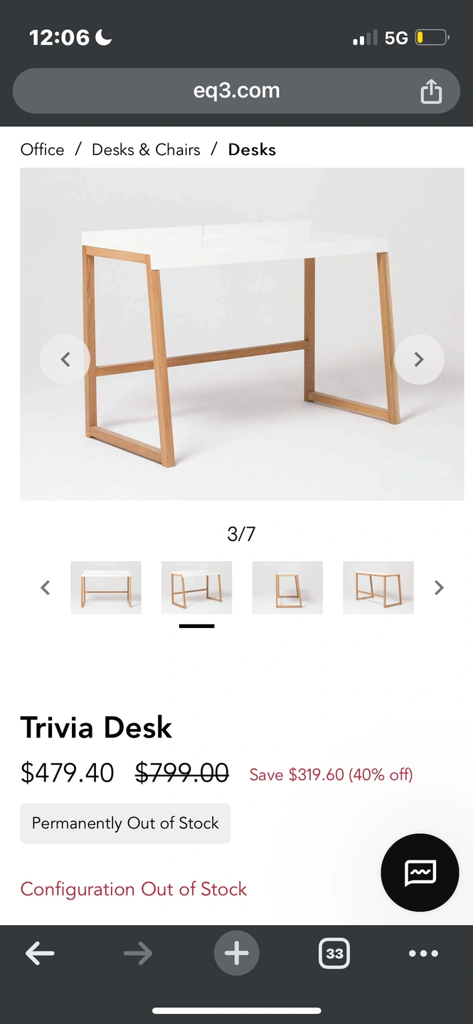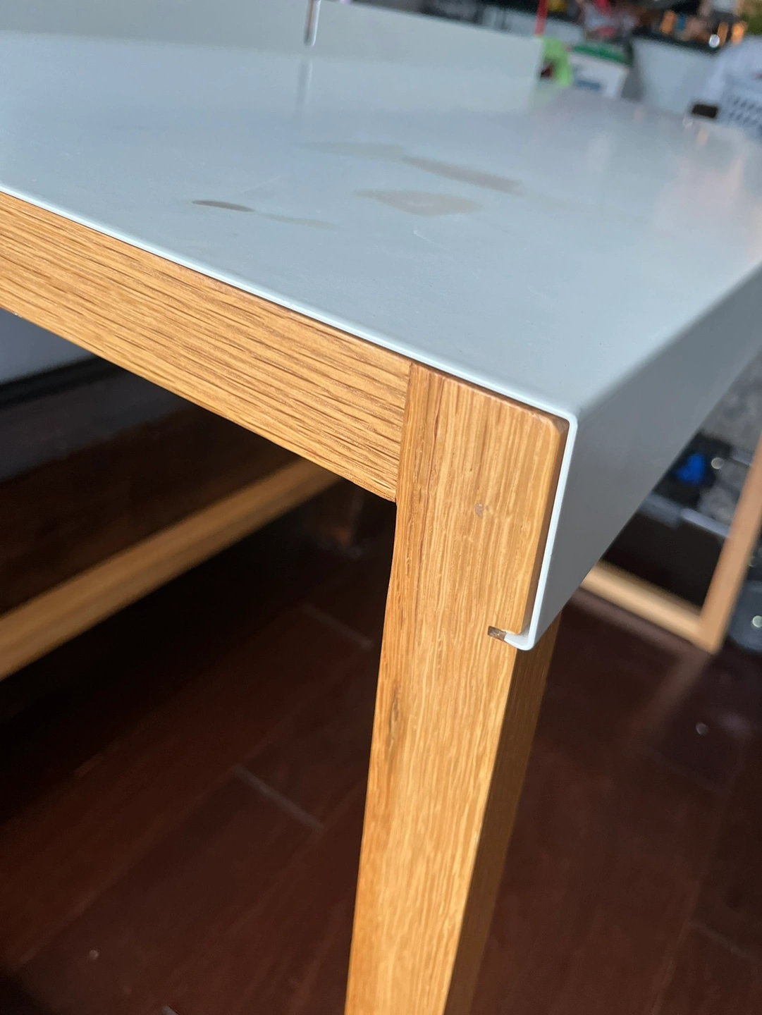 From EQ3: This simple yet clever marriage of solid wood and powder-coated metal come together to create a piece that is durable, functional, and modern. The sturdy, clean design of this desk will add a touch of modern utility to your space.