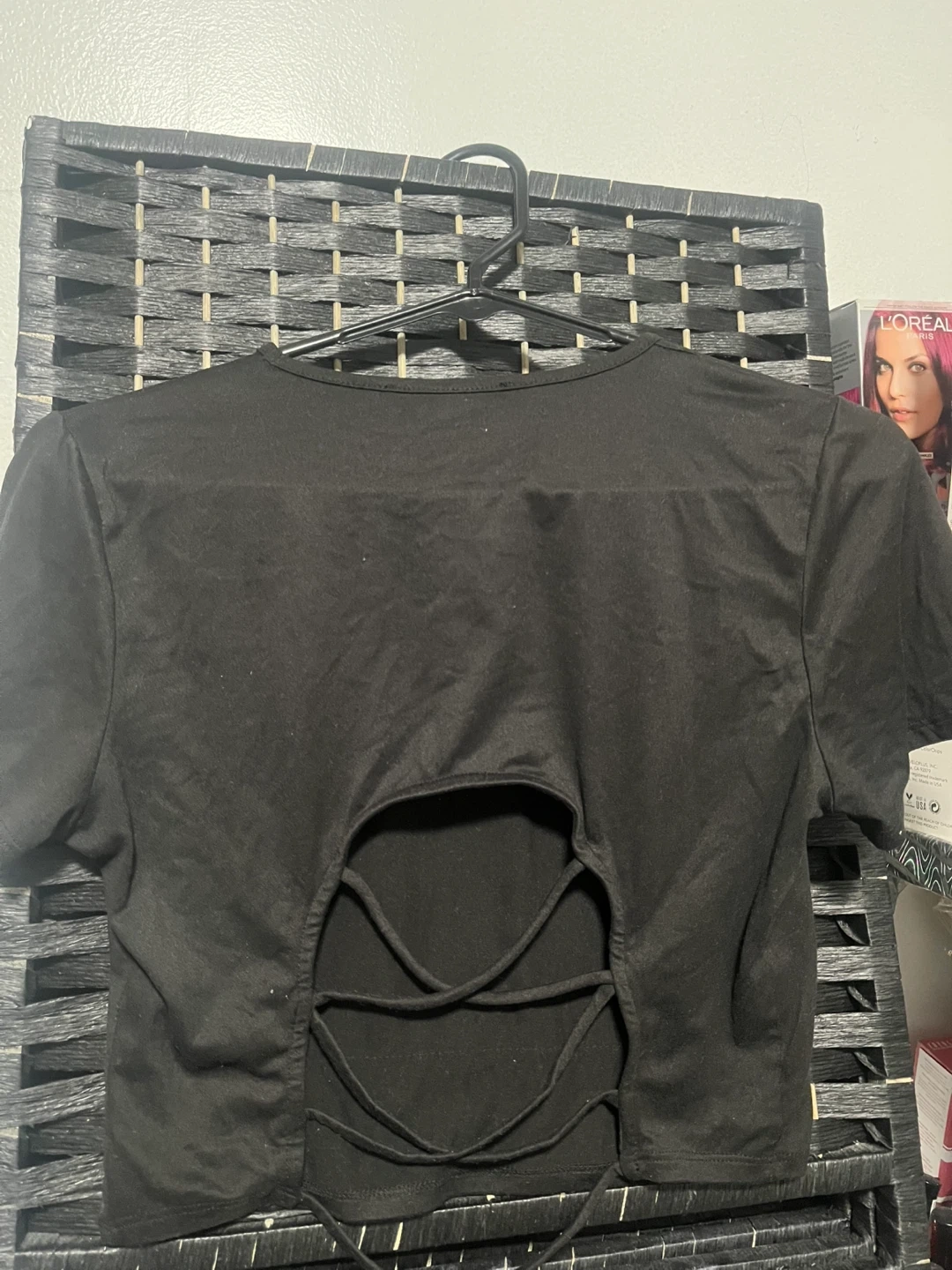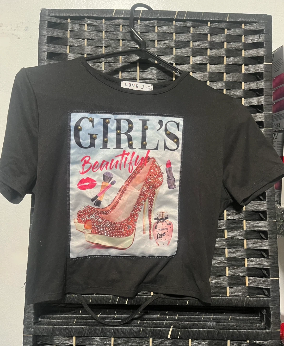 Black short-sleeve crop top by LOVE J. It features a graphic print on the front with "Girl's Beautiful" text, a high-heeled shoe, lipstick, and perfume bottle. The back has a criss-cross strap detail. Made from a soft fabric.