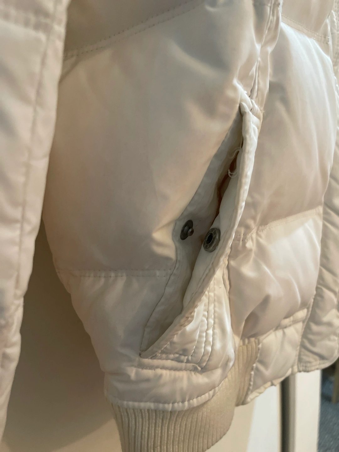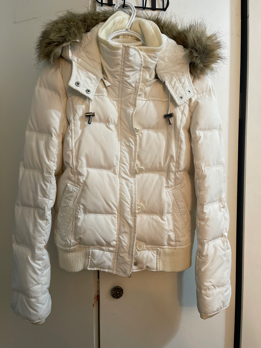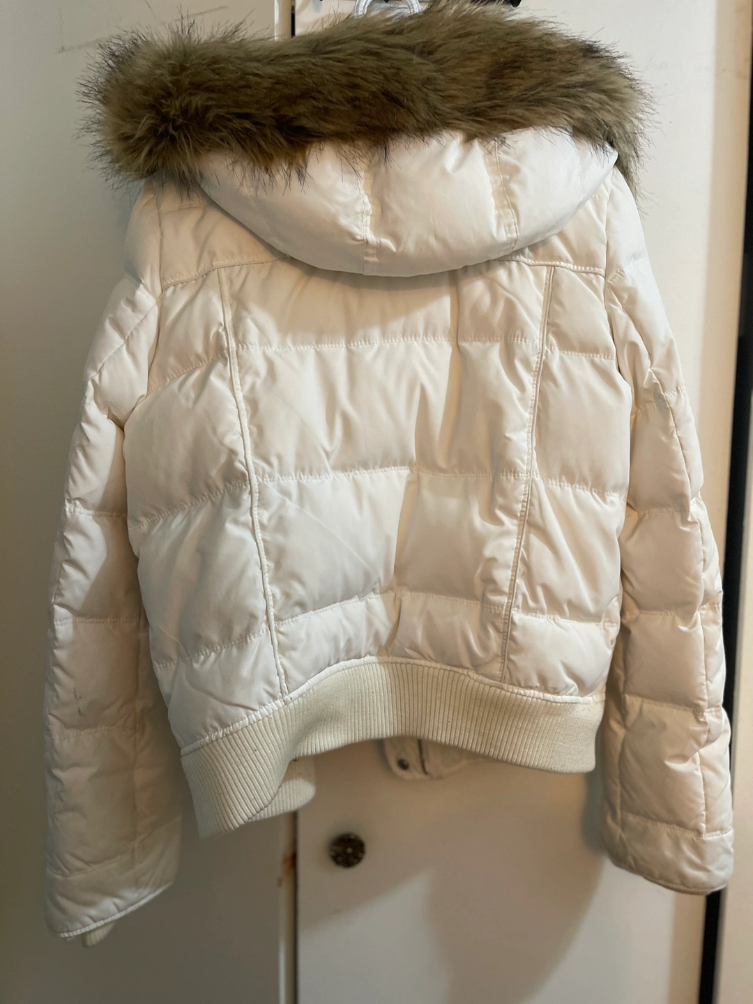 Was purchased for 250 dollars. In good condition, Stay comfy and on-trend all winter long with this cold-weather essential. Crafted in a sleek nylon satin, with a nice hood for extra warmth, this practical design will keep you comfortable and cosy on the go. Elevate your winter style effortlessly with this fashion-forward jacket.