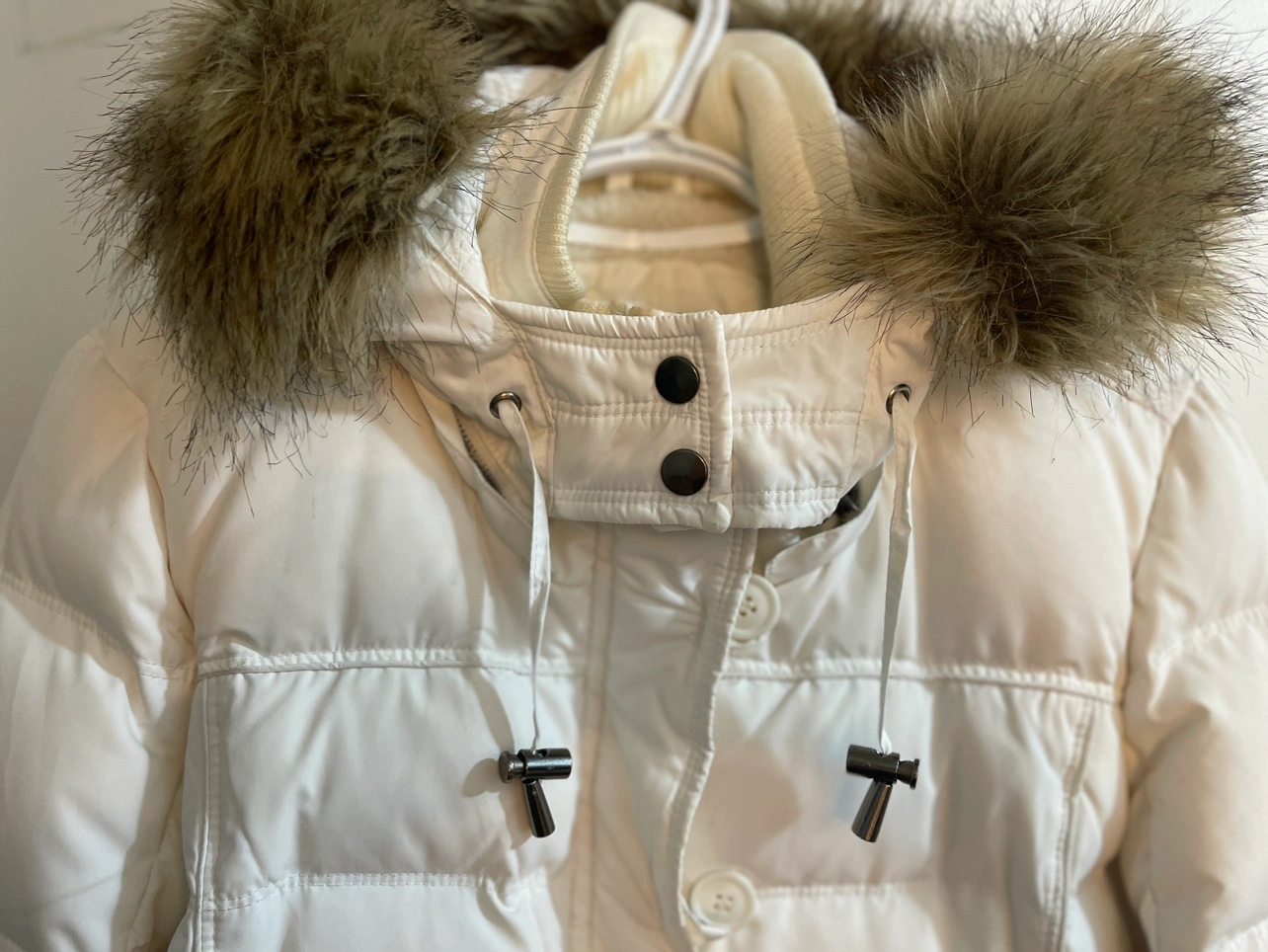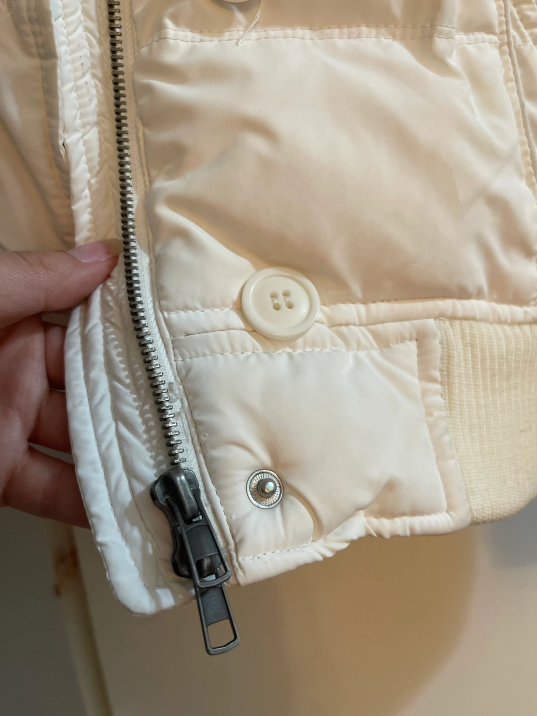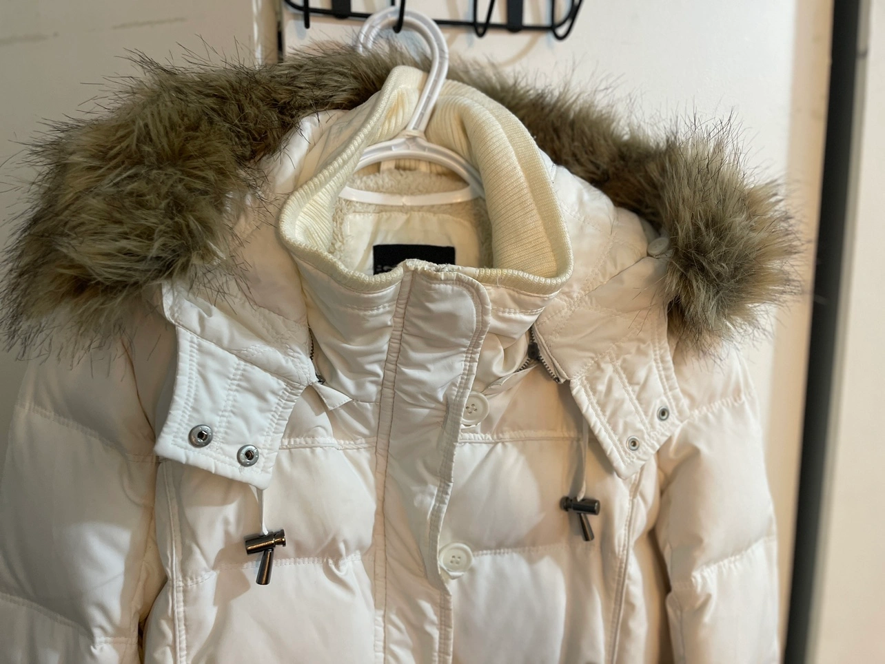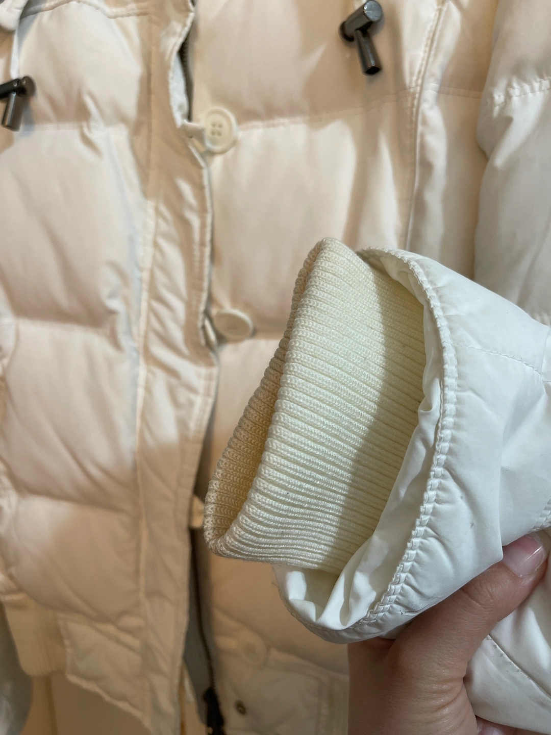Was purchased for 250 dollars. In good condition, Stay comfy and on-trend all winter long with this cold-weather essential. Crafted in a sleek nylon satin, with a nice hood for extra warmth, this practical design will keep you comfortable and cosy on the go. Elevate your winter style effortlessly with this fashion-forward jacket.