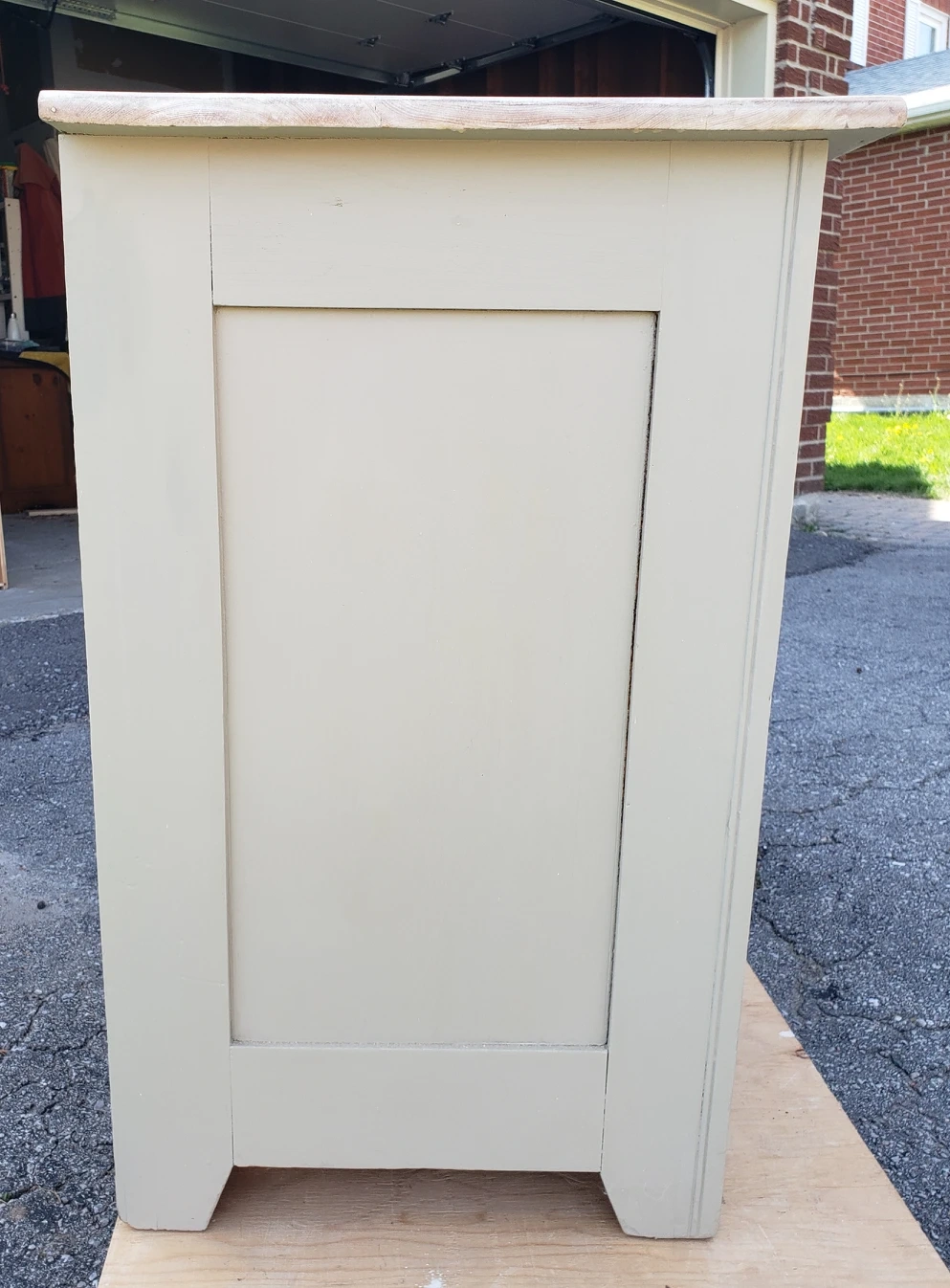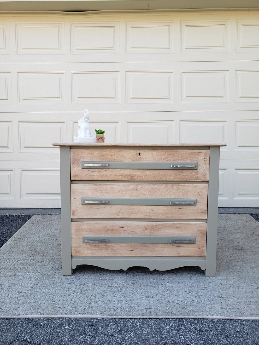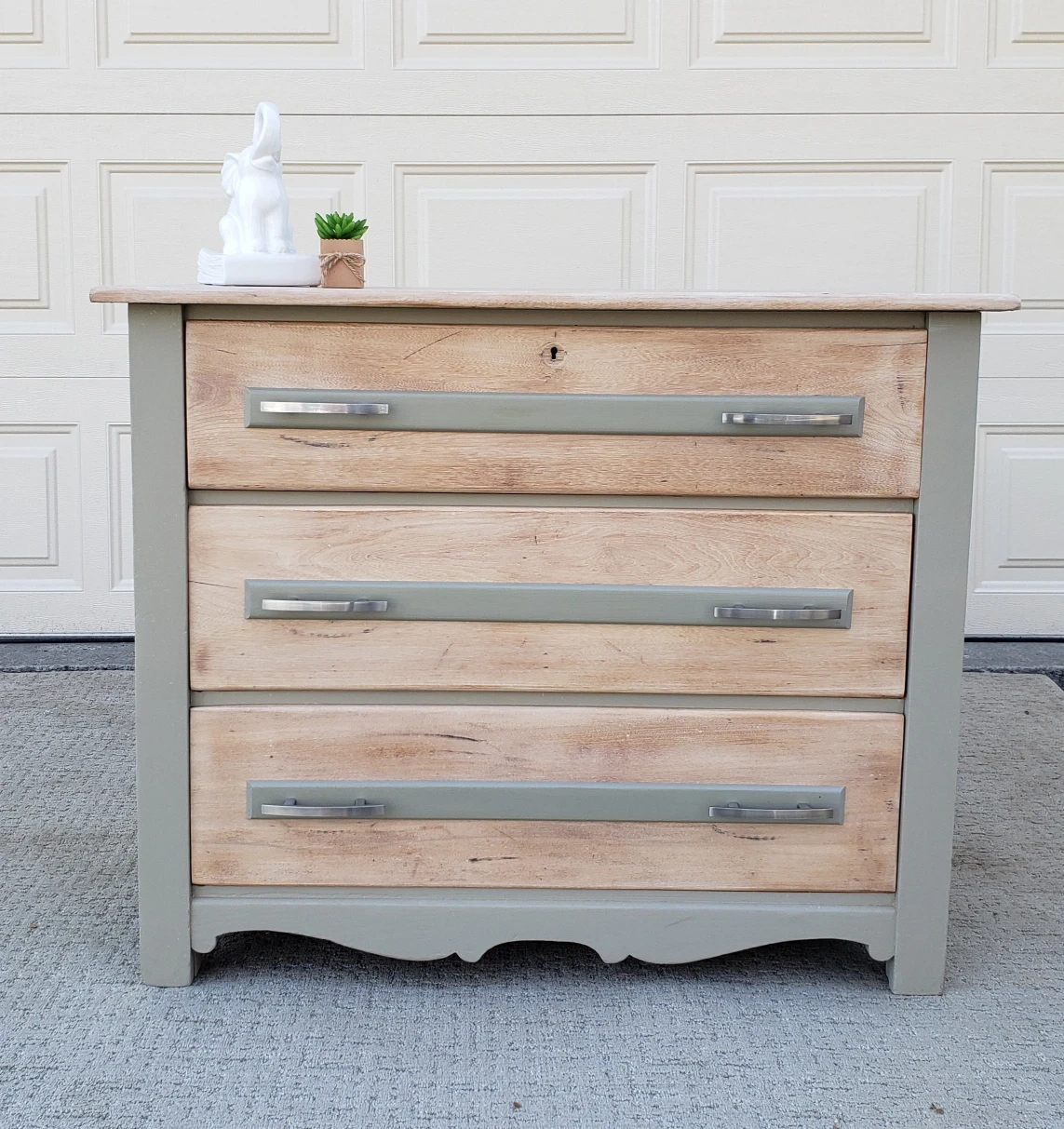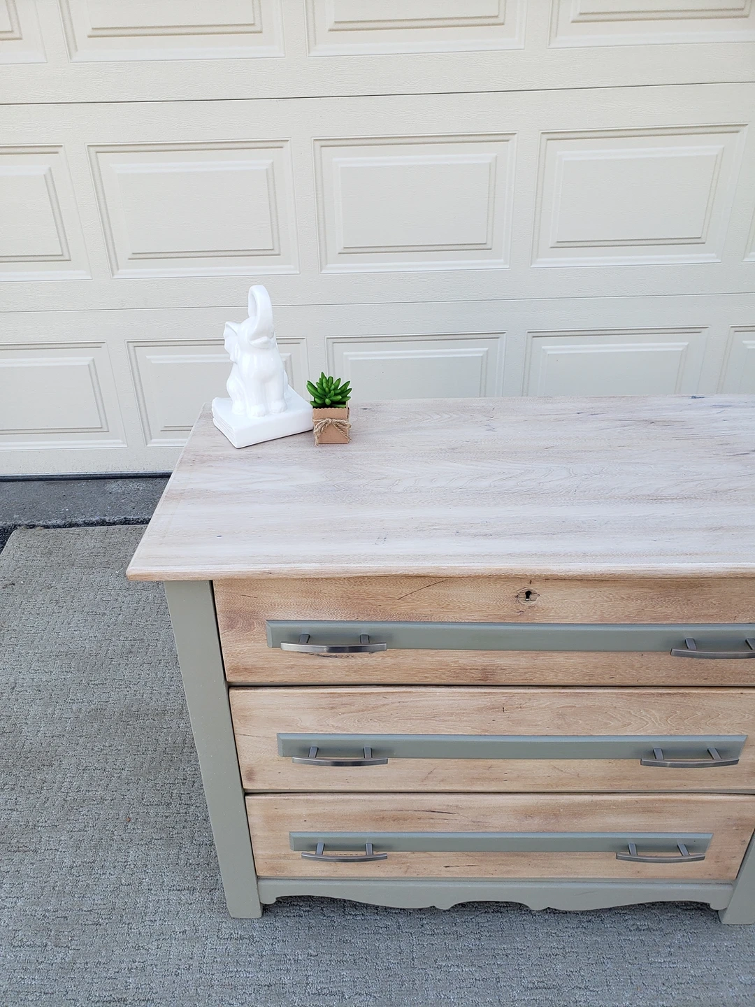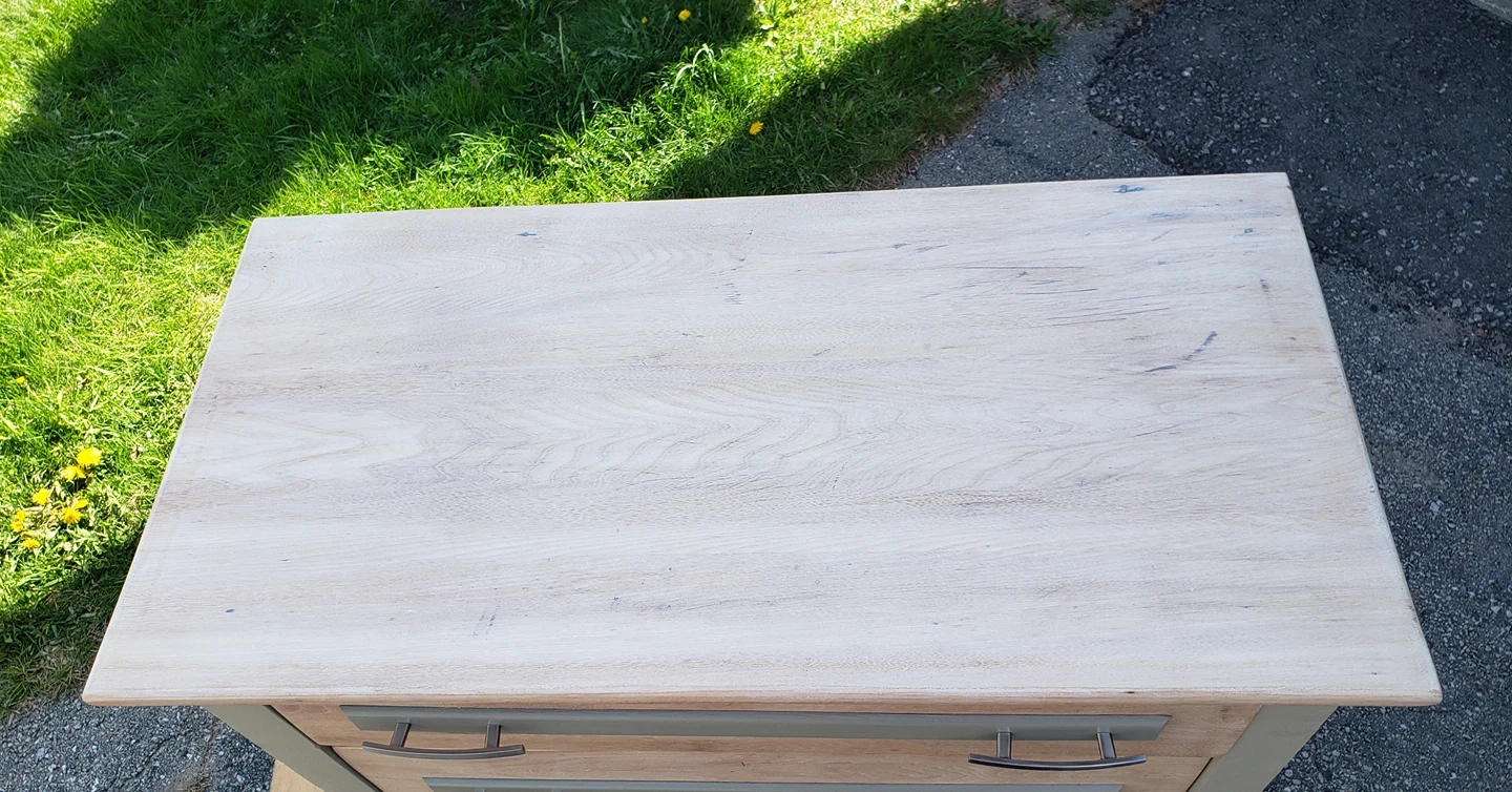 The colours are Sun Bleached stain and Dried Sage. The drawers have been lined and slide easily.