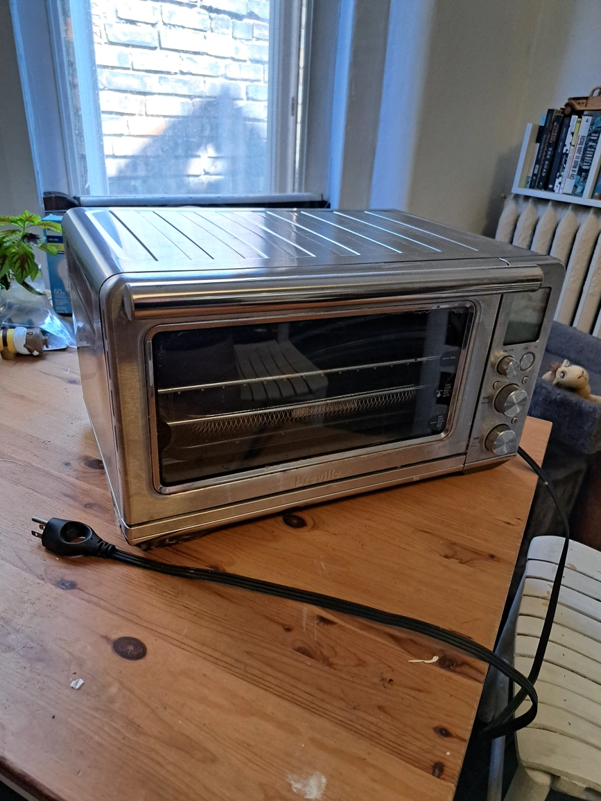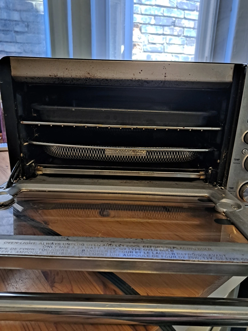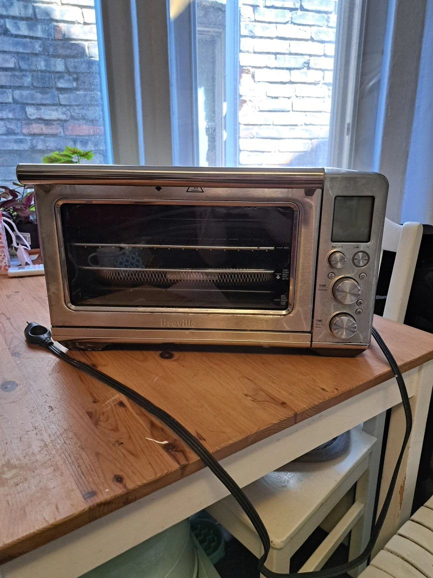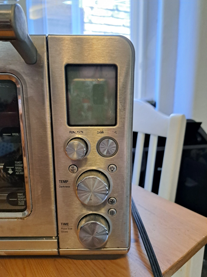 Well loved but in good condition air fryer plus toaster oven that has rack, fryer basket, and baking sheet. Features display to confirm options. Some if the labels are mildly worn, but I can go over them with you! It works great, we just don't have space for it anymore.