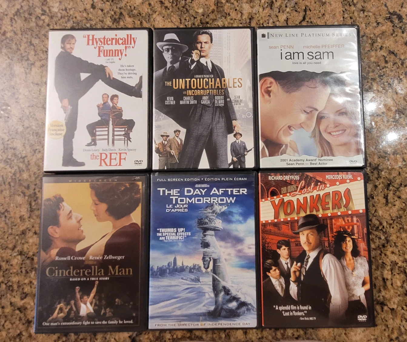 Multiple different titles of movies and comedy DVDs in EUC. Willing to work on a better price if you are interested in multiple titles. Titles include: Alive Amistad An Inconvenient Truth Apollo 13 Bend it like Beckham Borat Bowling for Columbine Casino Casino Royale Catch me if you can Chris Rock Bring the Pain Chris Rock - Bigger and Blacker Cinderella Man Coach Carter Cold Mountain Chuck & Larry get married Donnie Brasco Eddie Murphy - Delirious Eddie Murphy - Raw Fahrenheit 911 Finding Forrester Gladiator Good night, and good luck Grumpier Old Men Happ Feet Head of State Hotel Rwanda I am Sam In America Invictus Leatherheads Lost in Yonkers Mambo Italiano Marie Antoinette Mona Lusa Smile Monster's Ball My Cousin Vinny Nuemberg Our Idiot Brother Pay it forward Precious Priates of the Carribean: The Curse of the Black Pearl Priates of the Carribean: Dead Man's Chest Priates of the Carribean: At World's End Sicko Radio Raging Bull Ray Religious Rush Hour Russell Peters: Outsourced Russell Peters: Red, White, and Brown Saving Private Ryan Scent of A Woman School of Rock Seabiscuit Simon Birch Spider-man 1,2, and 3 Stand and Deluvery Stevie Griffin - The Untolded Story Talladega Nights The Bourne Identity The Bourne Spremacy The Bourne Ultimatum The Day after tomorrow The Departed The Persuit of Happiness The Reader The Ref The Rocket The Sixth Sense The Thin Red Line The Untouchables Training Day U2 - Rattle and Hum We Are Marshall Wayne's World Come from a smoke & pet free home.